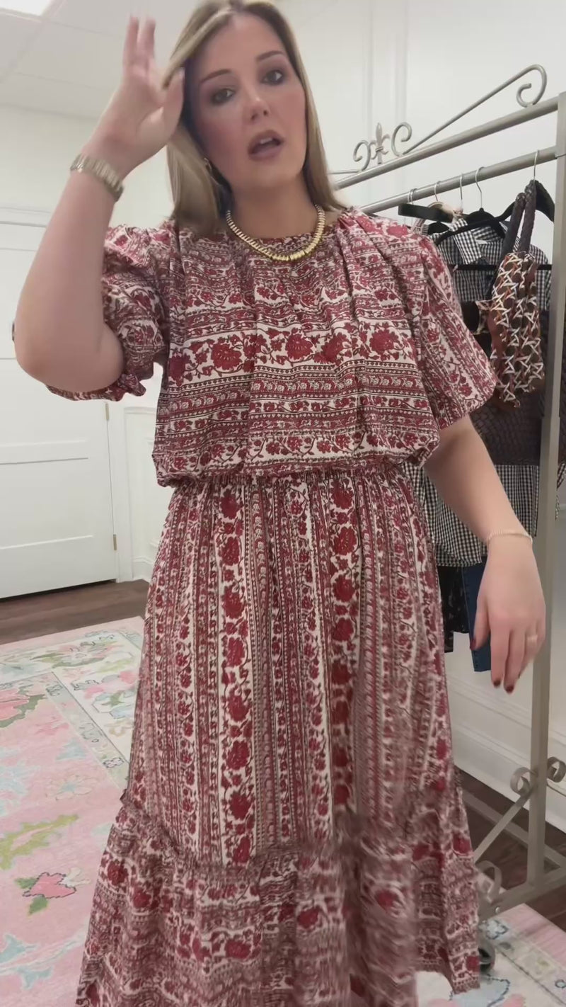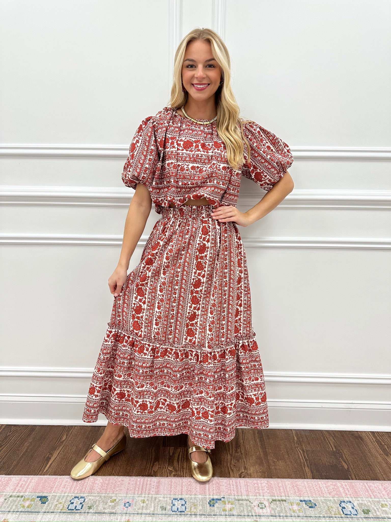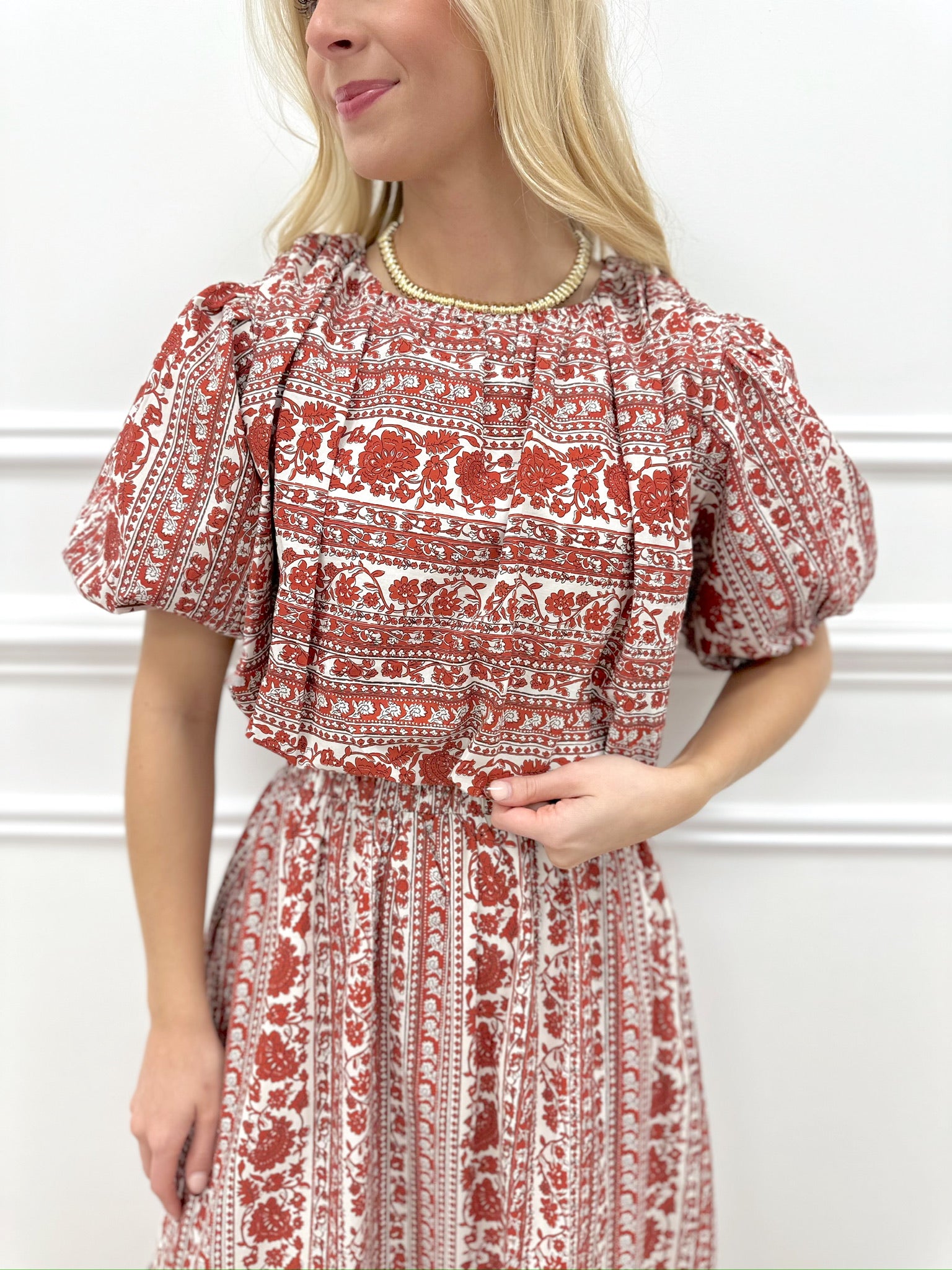 The Kacey Printed Top features a playful fall-inspired brick red and cream bubble print, perfectly styled to match its coordinating skirt. Available in sizes XS to Large, it offers a true-to-size fit for effortless wear. Whether dressing up or down, this top adds a fun, seasonal touch to your wardrobe with comfortable, flattering style.