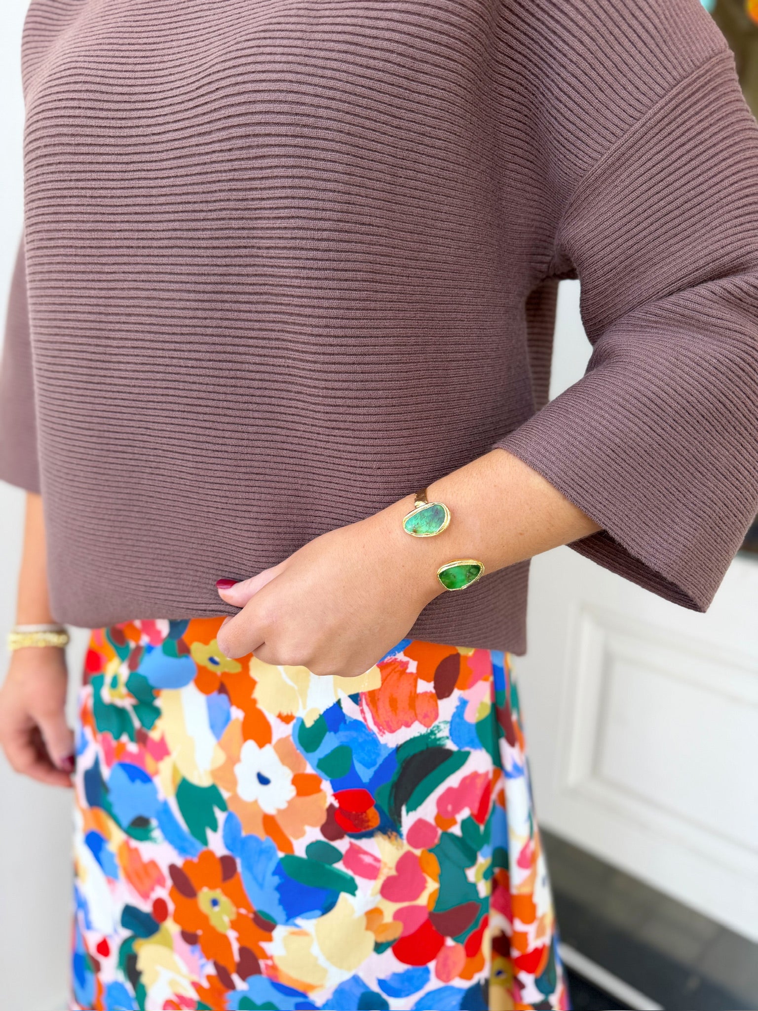 Make a bold statement with the EE Irregular Stone Cuff in vibrant green. This eye-catching piece features a natural stone design with an organic, unpolished aesthetic that adds character and personality to any outfit. The irregular shape creates visual interest while the rich green hue brings an earthy, refreshing vibe to your wrist. Perfect for those who love distinctive jewelry that stands out, this cuff pairs beautifully with both casual and dressed-up looks. Embrace your unique style with this conversation-starting accessory.