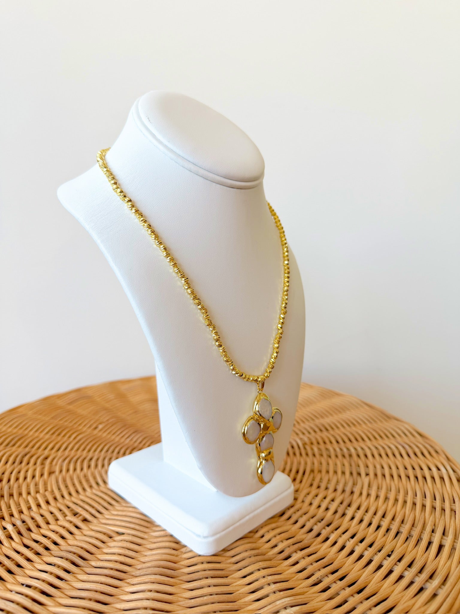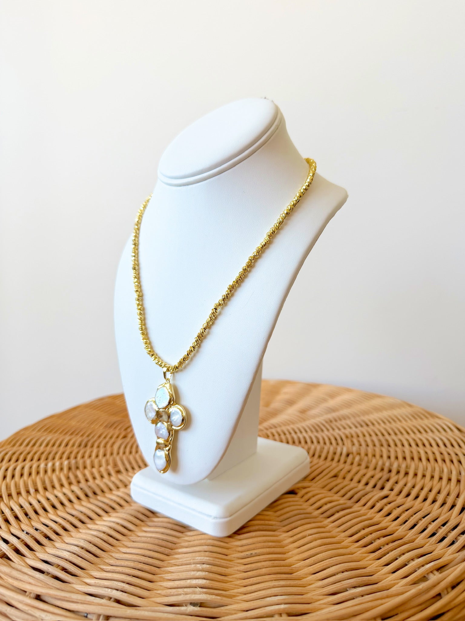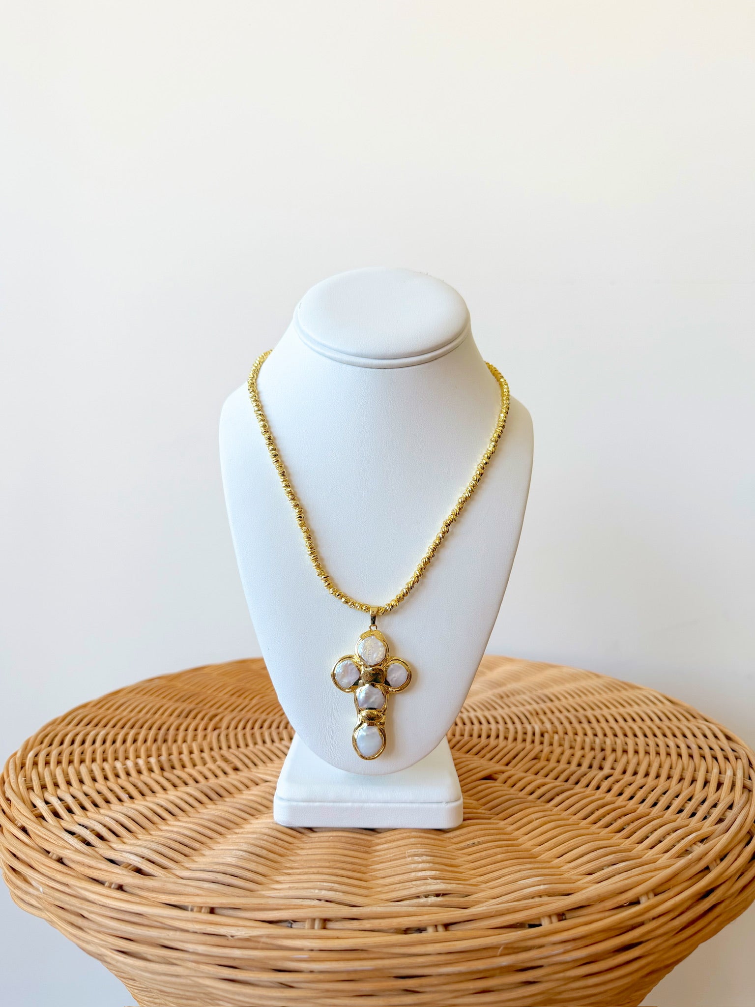 Introducing the EE Pearl Cross Pendant Beam Chain-18"! A must-have statement piece that will elevate any outfit and make you stand out. Show your unique style and make a bold statement with this stunning cross pendant and beam chain. A perfect gift for yourself or a loved one.