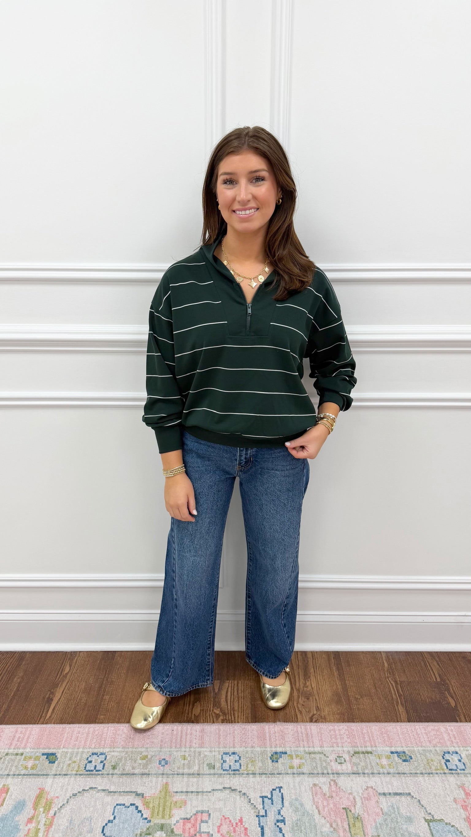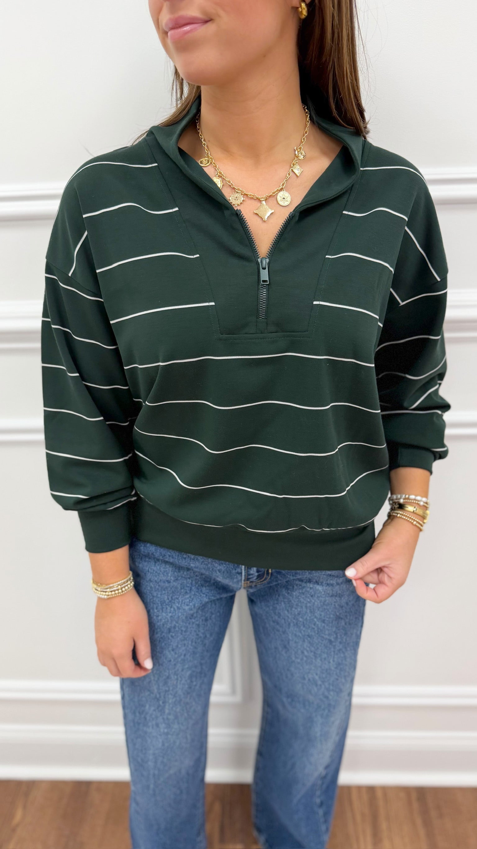 The Callie Striped Top in Green is the essential quarter zip you've been waiting for. Featuring timeless stripes and a rich green colorway, this piece seamlessly transitions from season to season and occasion to occasion. Available in sizes small through large with true-to-size fit, you can shop with confidence knowing you'll get the perfect silhouette. Make it your new favorite layering piece that works as hard as you do.
