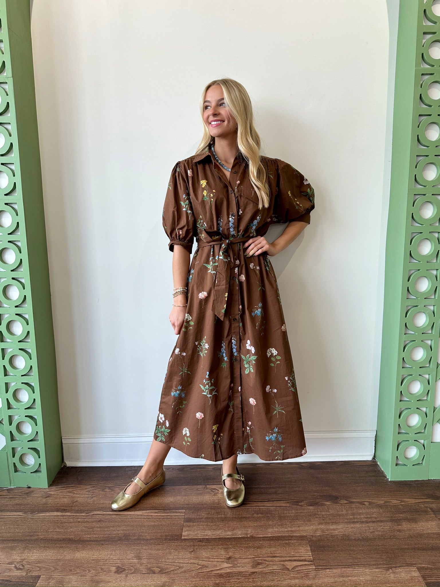 The Brandy Floral Dress is your go-to for effortless style, featuring a warm brown floral print, tie belt detailing, and a flattering button-up front. Slight puff sleeves add a subtle touch of volume, while its roomy fit ensures all-day comfort. Available in sizes small to large and true to size—Katelyn is wearing a small. Perfect for any occasion, this dress combines style and ease with every wear.