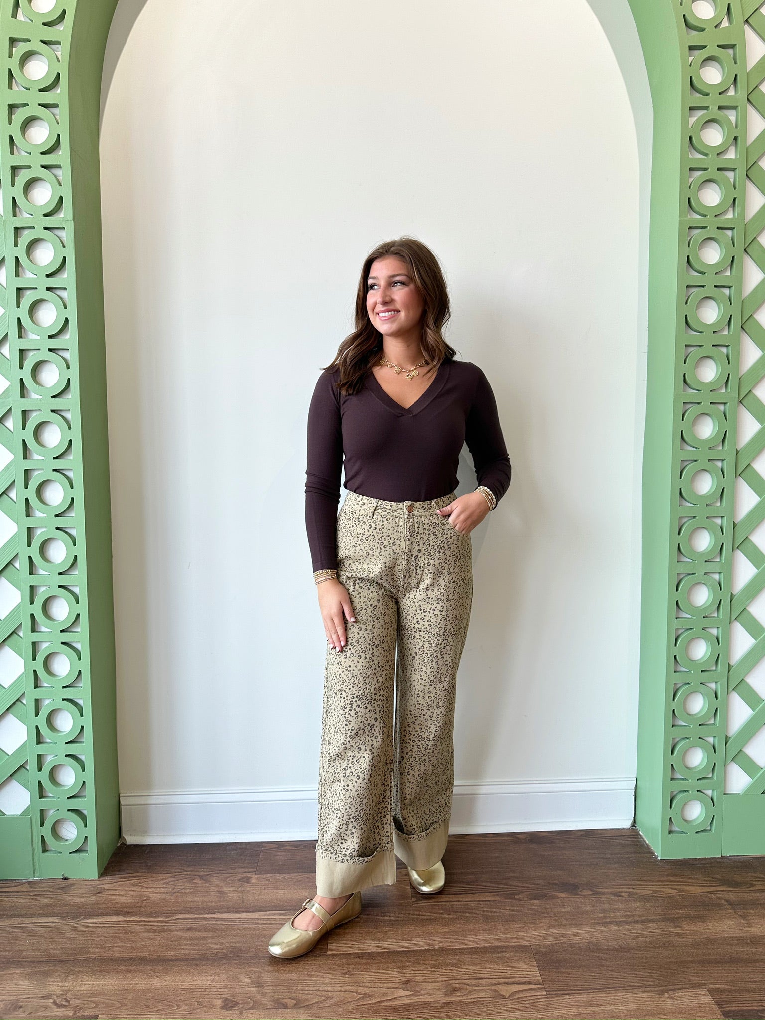The Kimmy Leopard Pants are a fall wardrobe essential, crafted from comfortable denim material with a trendy leopard print and stylish cuffed hems. Designed to fit true to size, they come in small through large—Alison is wearing a small. These pants effortlessly combine bold pattern with everyday wearability, making them perfect for standing out this season.