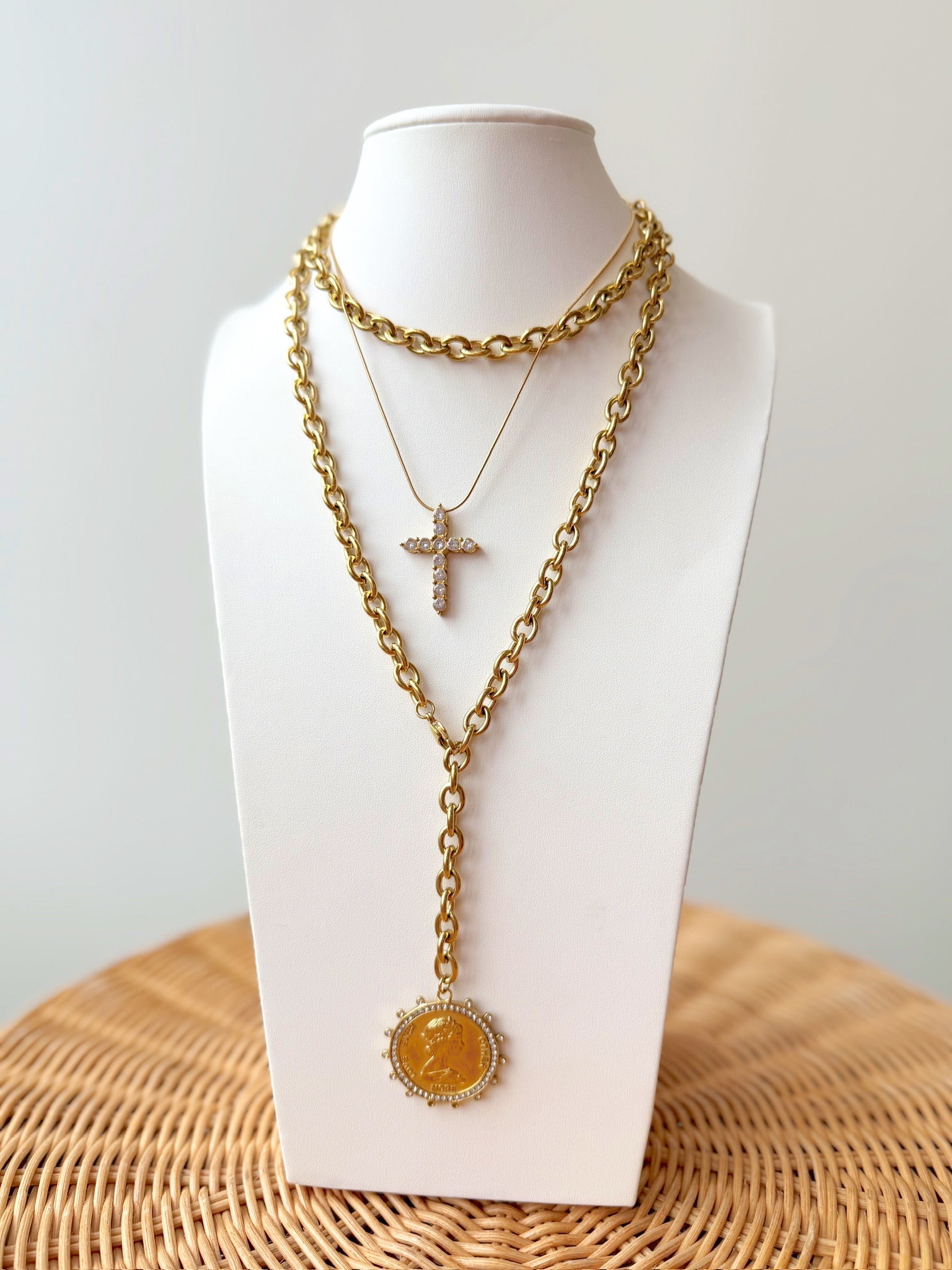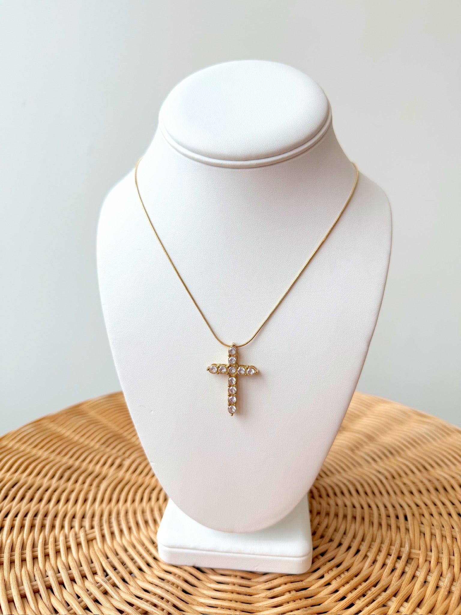 Embrace bold spiritual style with Meghan Cross Necklace—a must-have piece that commands attention. Featuring an eye-catching studded cross design, this necklace merges meaningful symbolism with contemporary edge. The intricate studded detailing adds dimension and visual interest, while our advanced non-tarnish coating keeps it looking pristine through years of wear. Whether you're layering it with other pieces or wearing it solo, this versatile necklace makes a powerful statement about your faith and fashion sense. Own a piece that's both spiritually significant and undeniably chic.