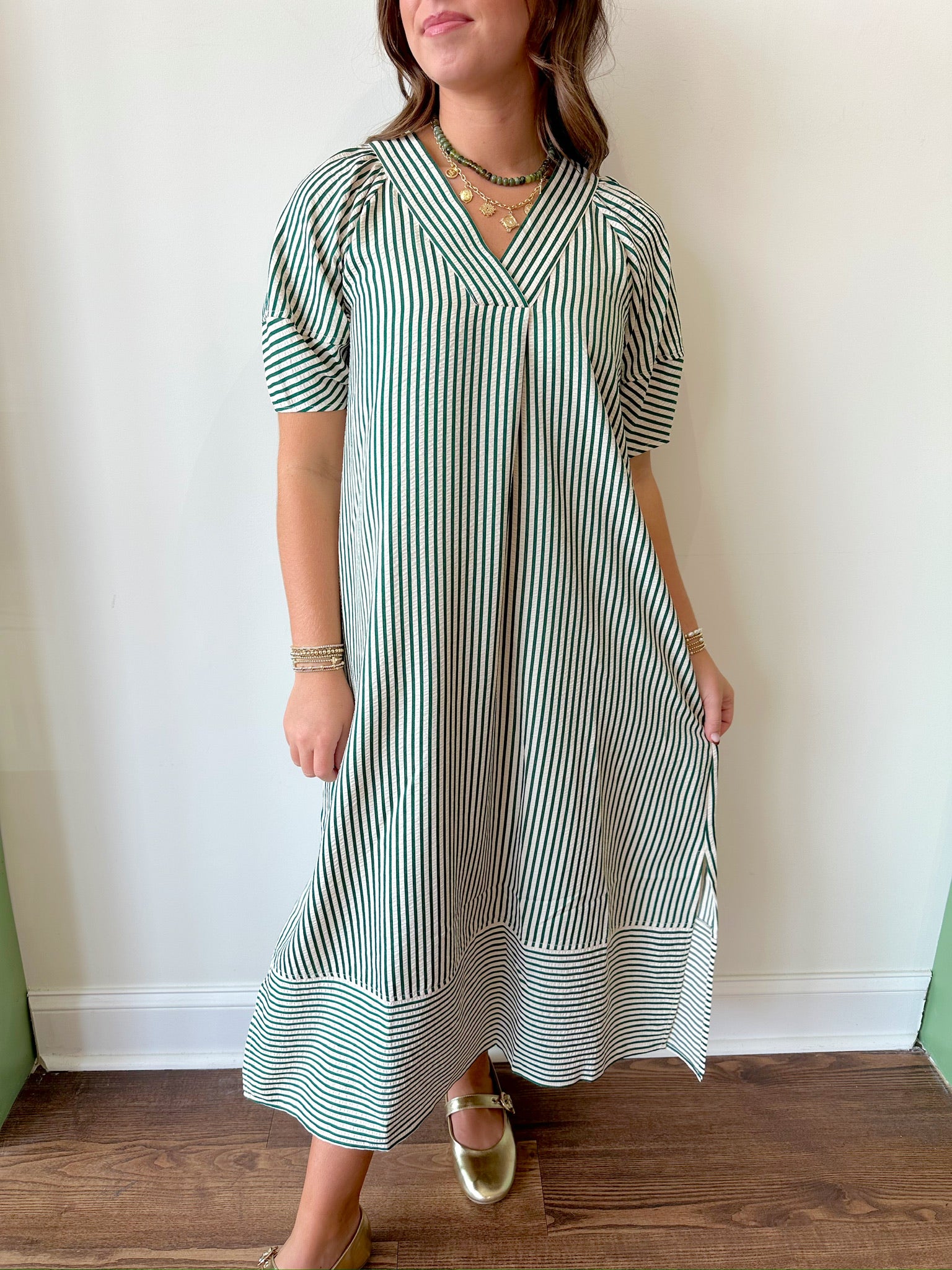 This lightweight Blake Striped Dress in green is a year-round essential. Featuring classic stripes, it offers a flattering fit that runs true to size. Available in black striped as well, this versatile dress effortlessly transitions from casual days to stylish evenings. Its comfortable fabric and timeless design make it a go-to for any occasion.