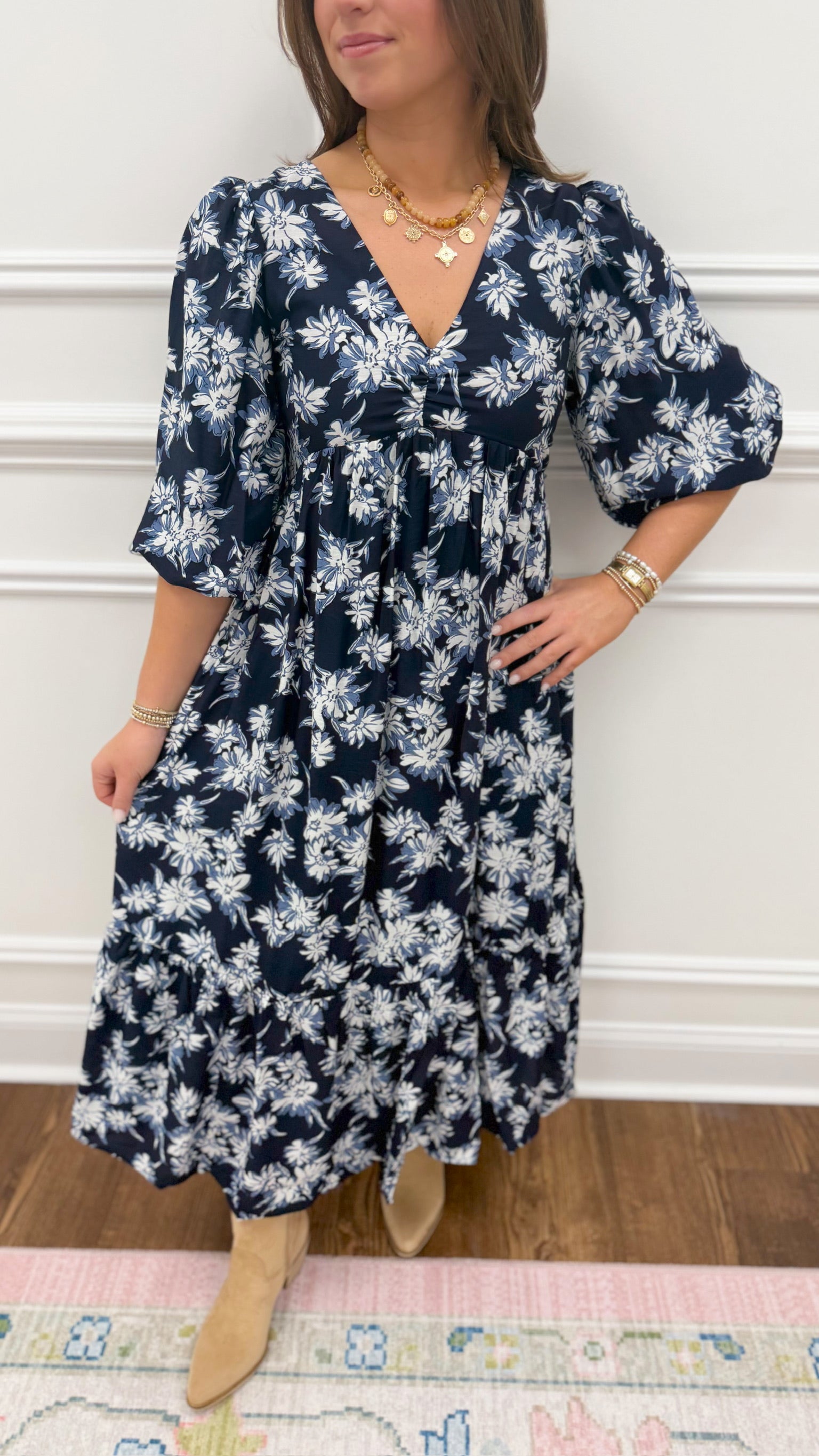 The Lynn Floral Dress brings effortless elegance to your wardrobe with its stunning navy floral design. Perfect for any occasion, this versatile piece transitions seamlessly from casual outings to special events. The thoughtfully crafted silhouette flatters every figure, while the timeless floral pattern adds a touch of sophistication. Available in sizes Small through Large, there's a perfect fit for everyone. Elevate your style with this must-have dress that combines beauty, comfort, and versatility in one stunning package.