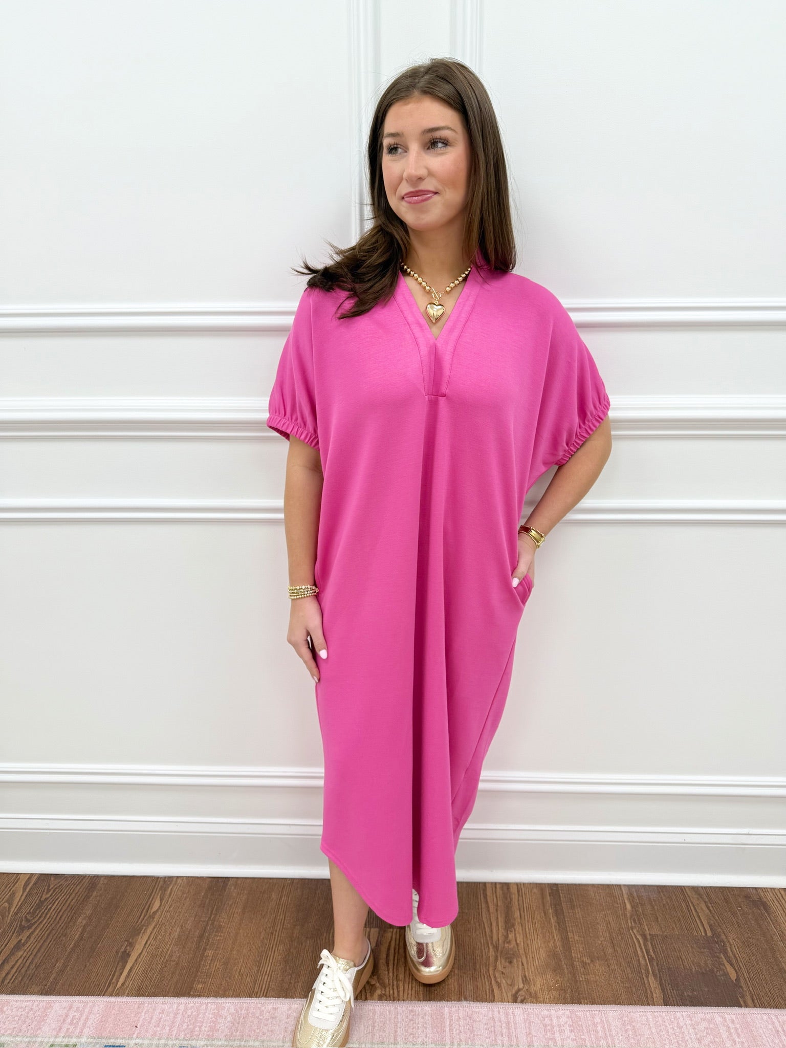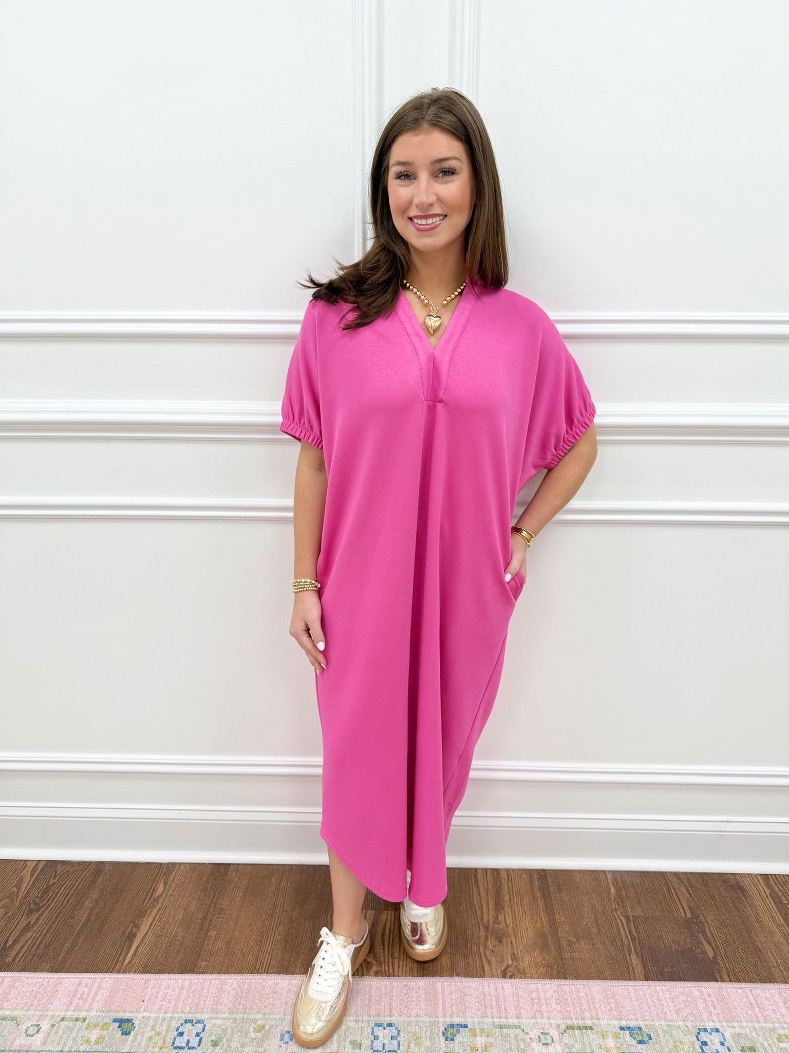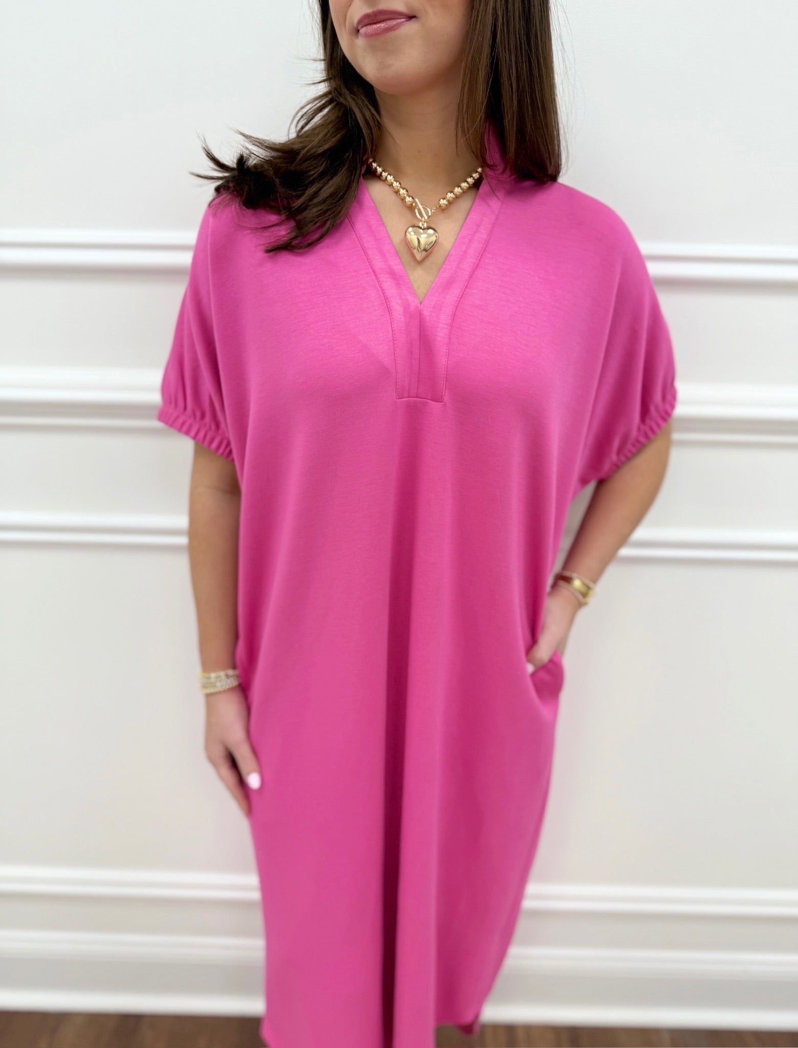 Discover the Marie Pink Dress, a luxuriously soft and cozy essential crafted from premium fabric that feels incredible against your skin. This flattering silhouette drapes beautifully and comes in sizes Small through Large, so you'll find your ideal fit. As seen on Alison in our Small size, this dress combines comfort with understated elegance, making it perfect for everything from casual outings to relaxed evenings. Experience the perfect balance of softness and style with a piece you'll reach for again and again.
