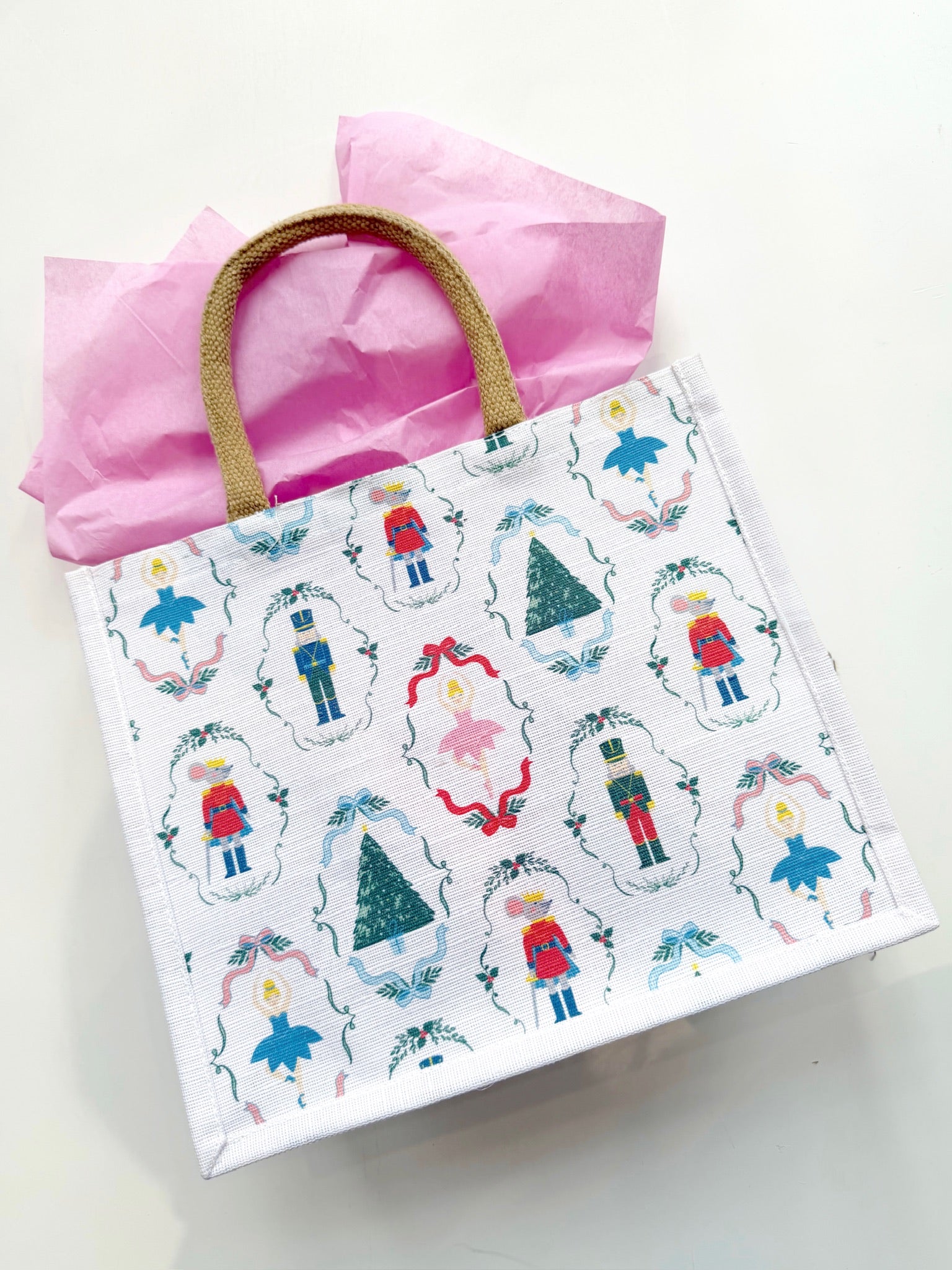 Make gift-giving magical with the Nutcracker Waltz Gift Tote. This charming, reusable tote features delightful nutcracker designs that turn any present into a festive presentation. Sturdy and stylish, it's perfect for carrying holiday gifts while adding an extra layer of seasonal cheer. Your recipients will love the thoughtful packaging, and they can reuse it year after year for storage, shopping, or décor. It's the gift that keeps on giving—practical, beautiful, and bursting with holiday spirit.