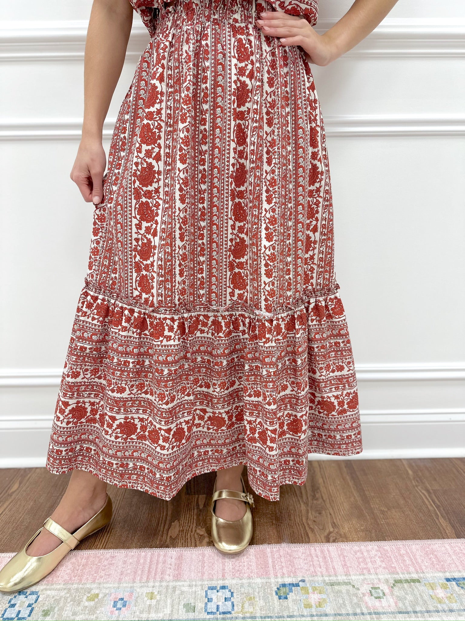 The Aubrey Printed Skirt features a charming cream and brick red pattern that perfectly complements the Kacey Printed Top. Designed to flatter true-to-size, it’s available in XS through Large. Whether paired together or styled separately, this skirt brings a fresh, fun vibe to your fall wardrobe. Katelyn is shown wearing the XS for a tailored fit.