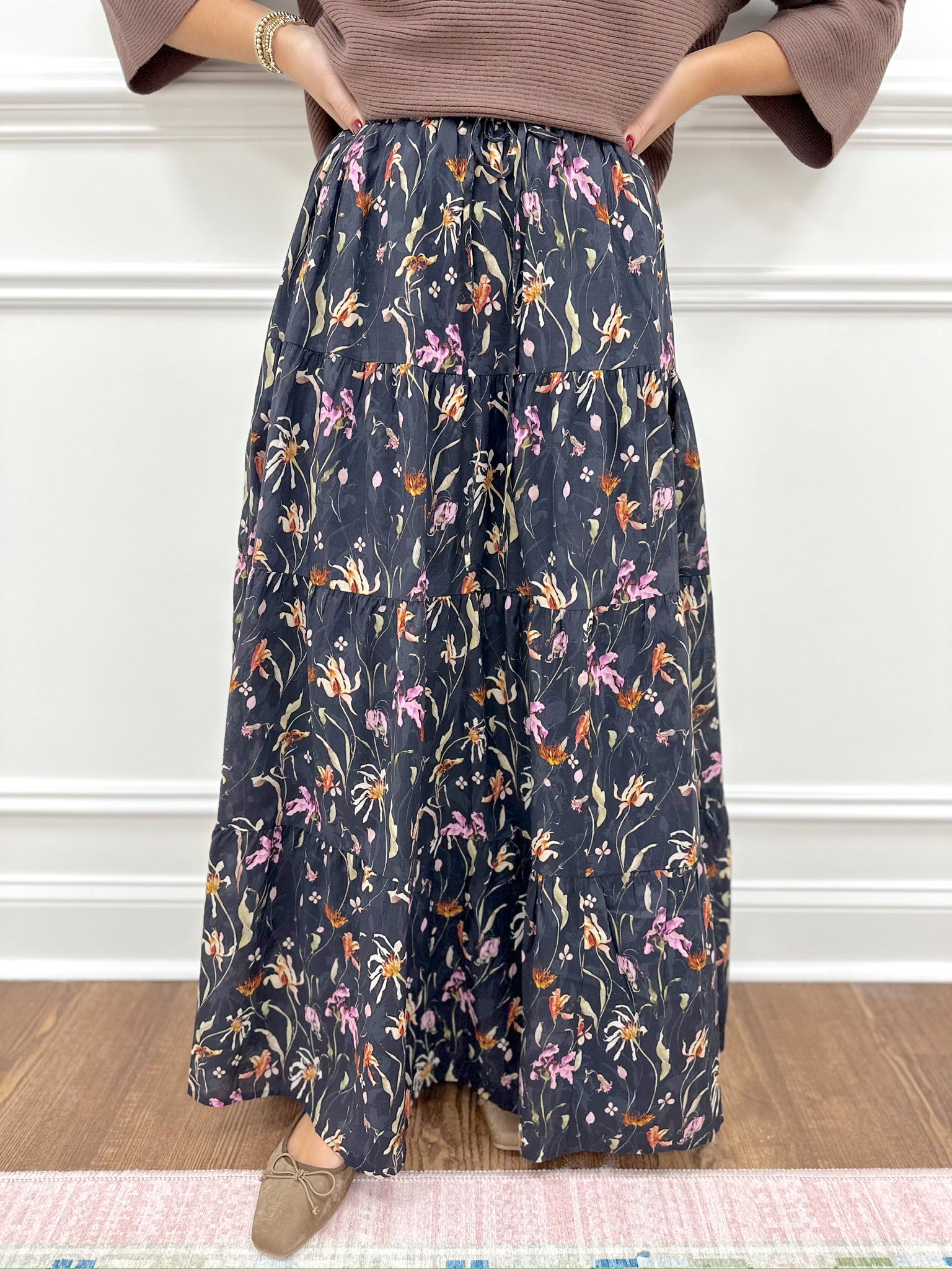The Allie Floral Skirt is a fun, fall-printed maxi skirt that’s effortless to dress up for any occasion. Available in sizes XS through large and running true to size, it offers a comfortable, flattering fit. Alison is wearing the XS, showcasing its versatility and flowy silhouette perfect for seasonal style.