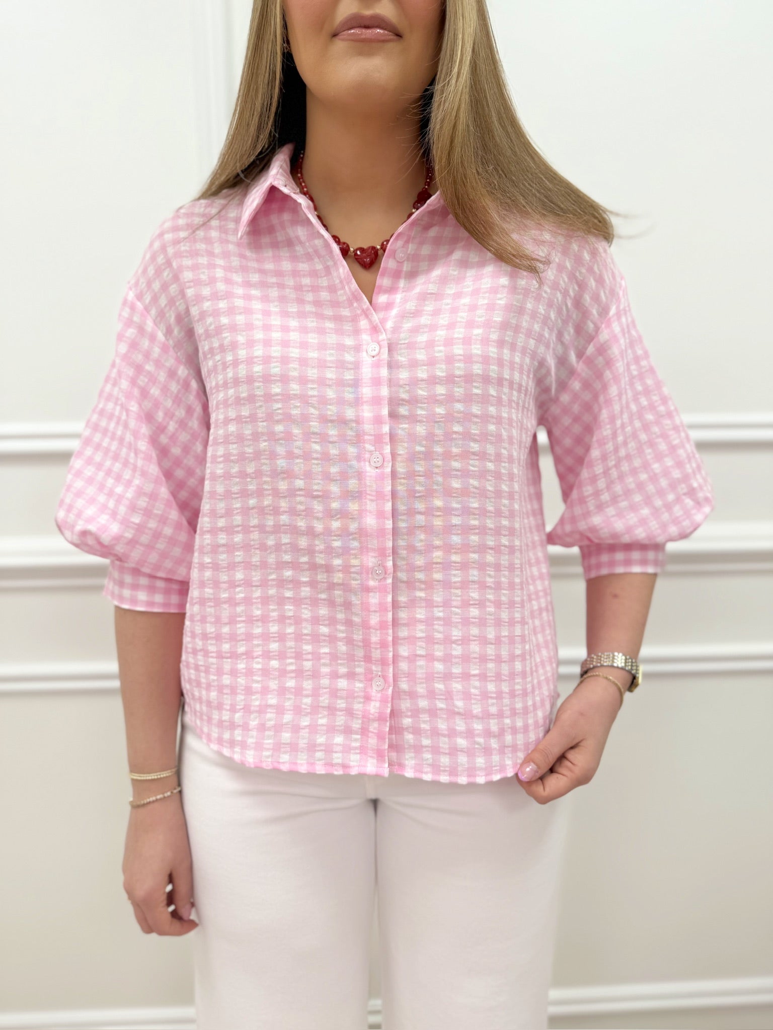 Turn heads with this vibrant white and pink gingham top, elevated by charming bubble sleeves that add dimension and playful movement. The classic gingham pattern brings timeless appeal while the voluminous sleeves give it a modern, fashion-forward edge. Running true to size, this piece is versatile enough for brunch dates, weekend adventures, or casual office days. Pair it with your favorite bottoms and watch this cheerful top become an instant wardrobe favorite that brings joy to every occasion.
