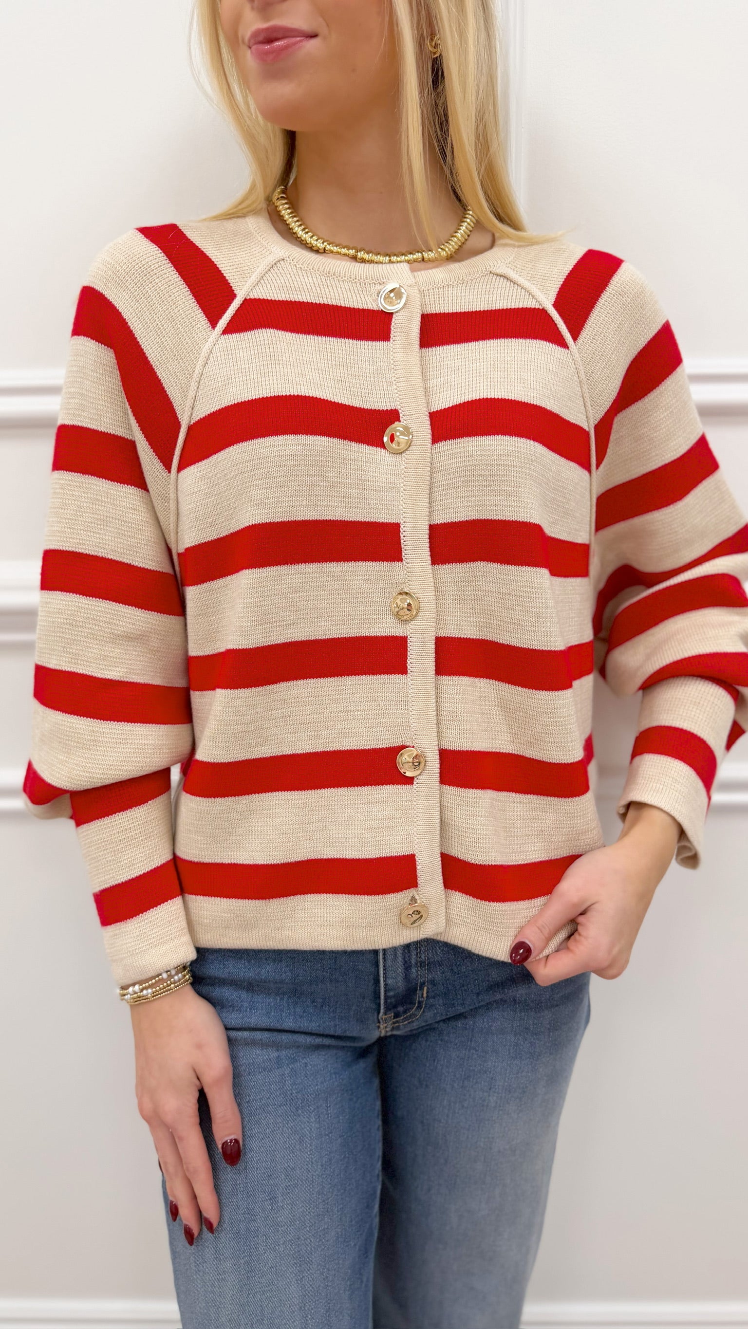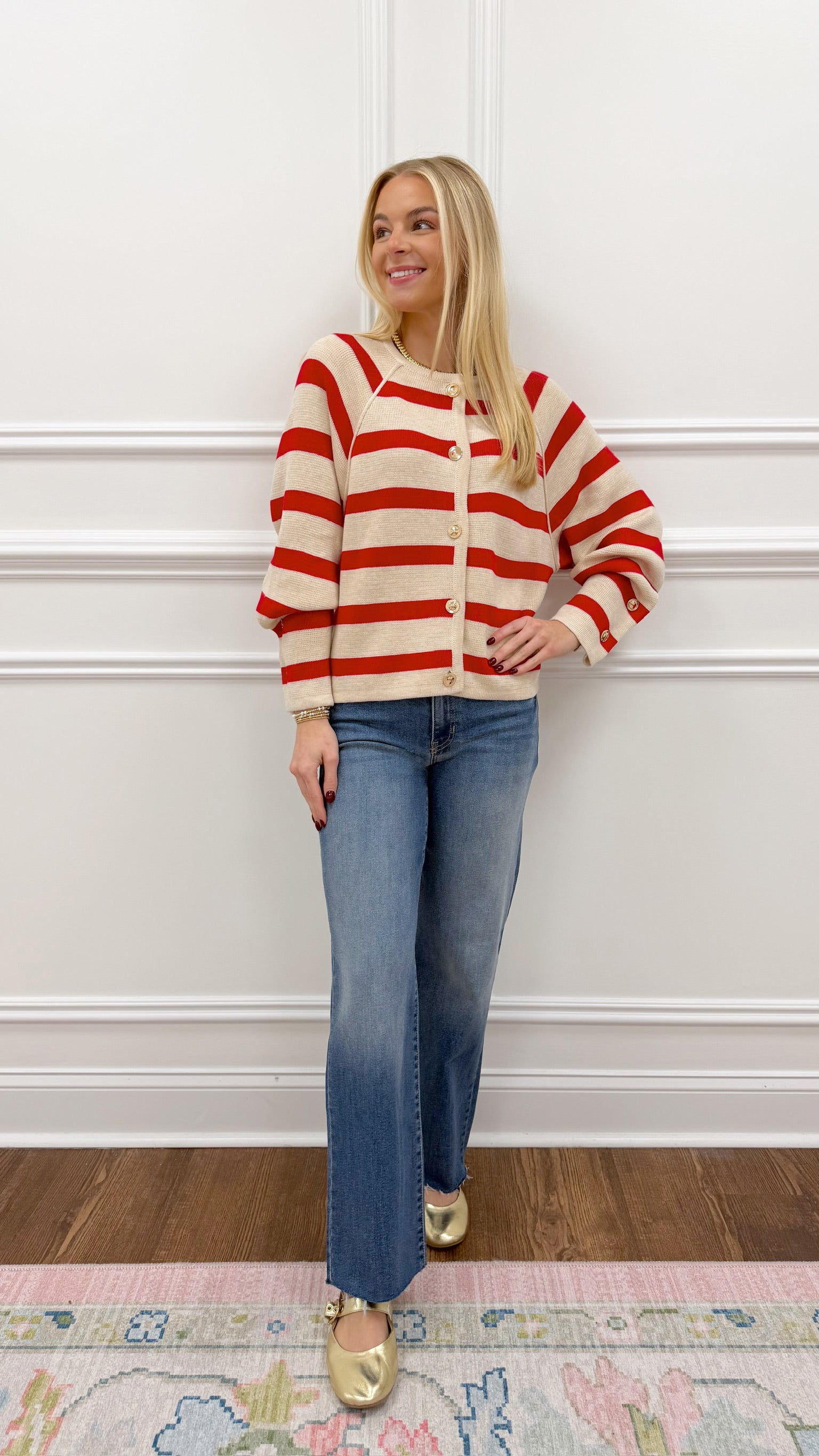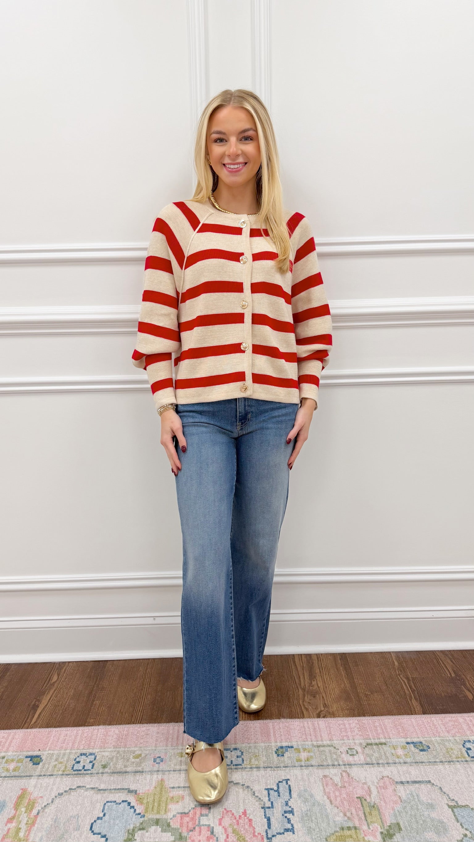 Introducing the Diana Striped Cardigan—the charming transitional staple that instantly elevates your everyday style. Built with superior craftsmanship, this delightful piece showcases elegant gold buttons that bring personality and polish to any ensemble. Offered in sizes small through large with a true-to-size fit, it's tailored for comfort and confidence. Whether you're layering over a dress, pairing with basics, or wearing it as a statement piece, this versatile cardigan is the go-to addition that makes getting dressed effortless and fun.