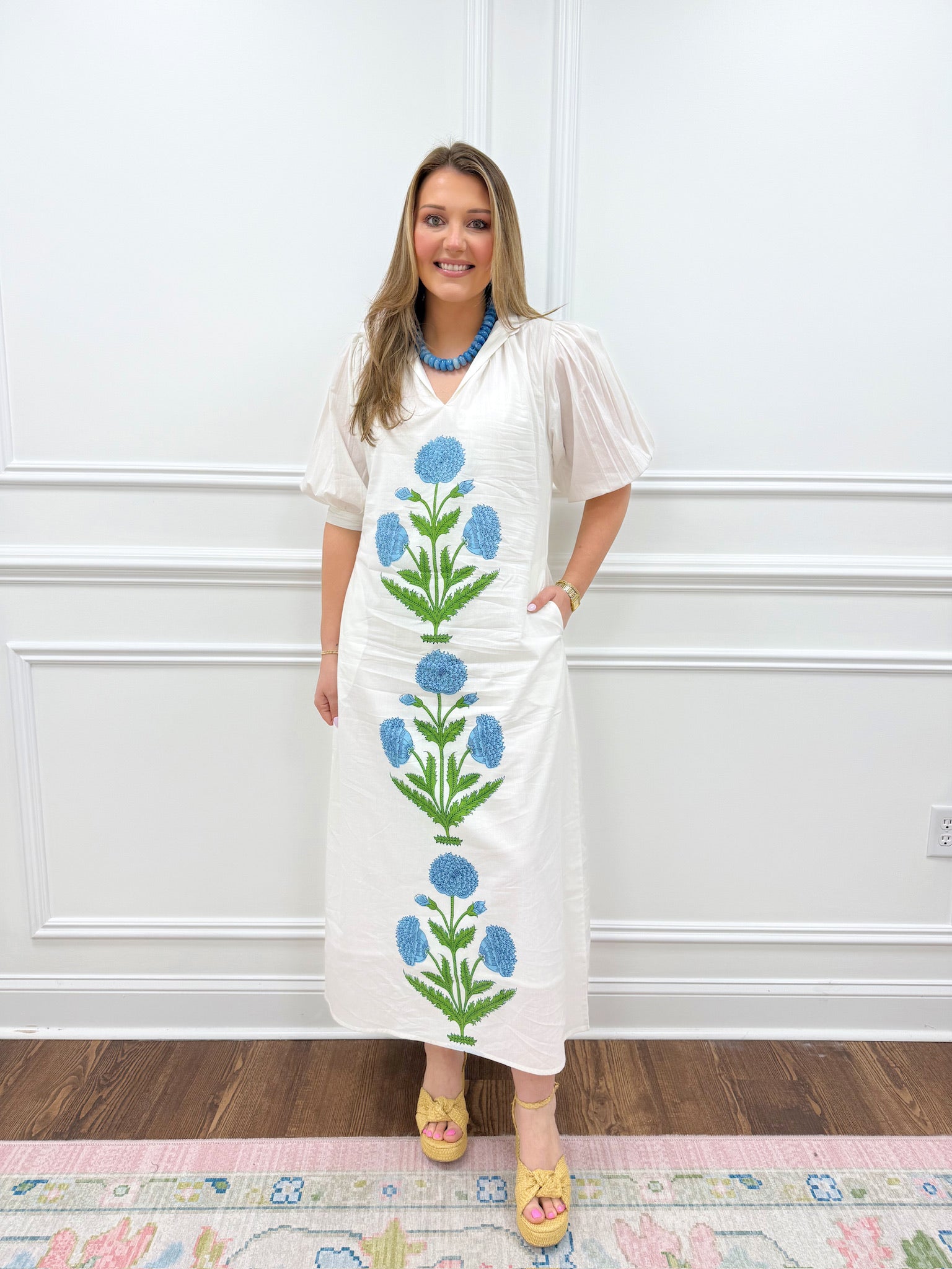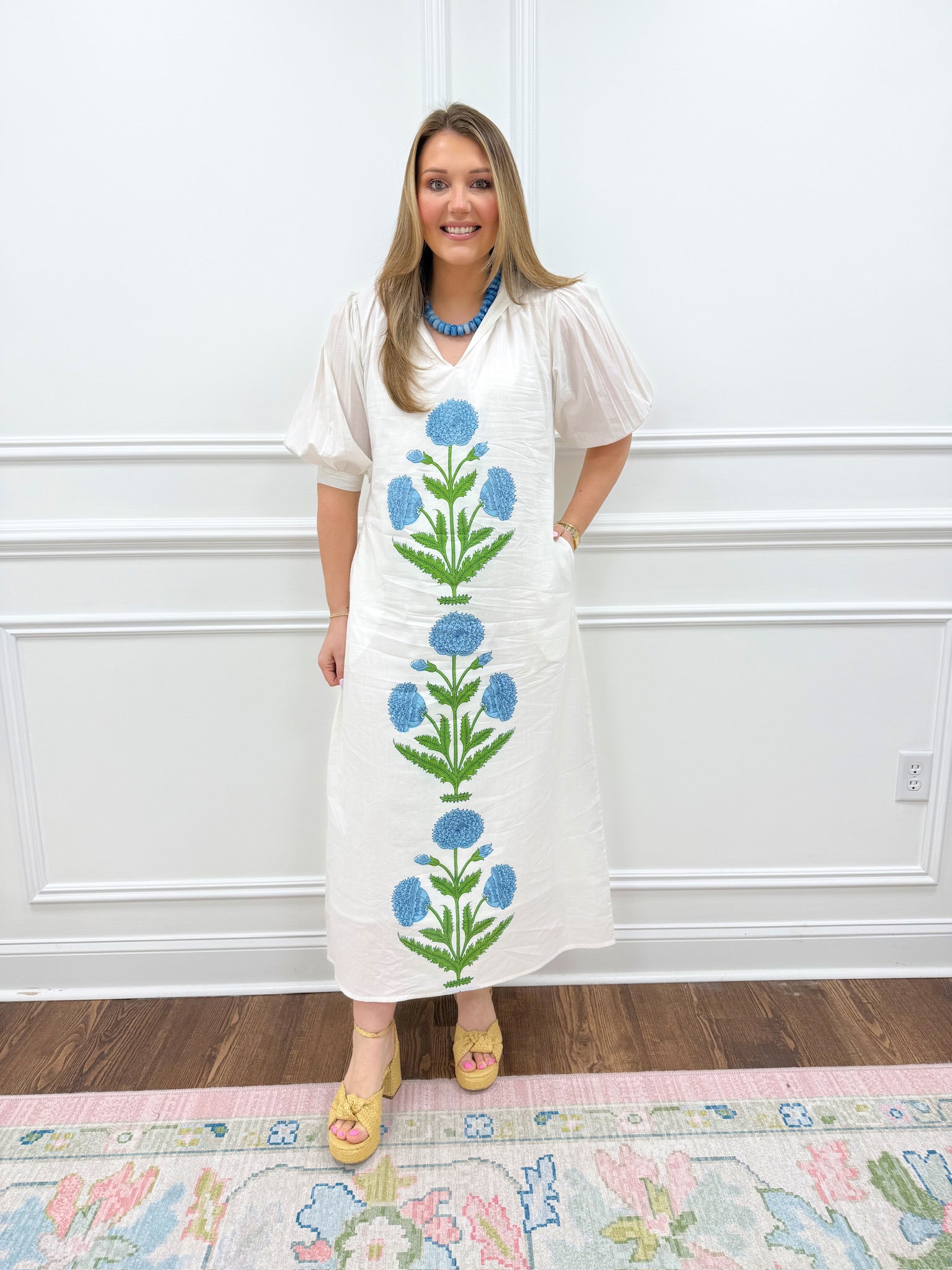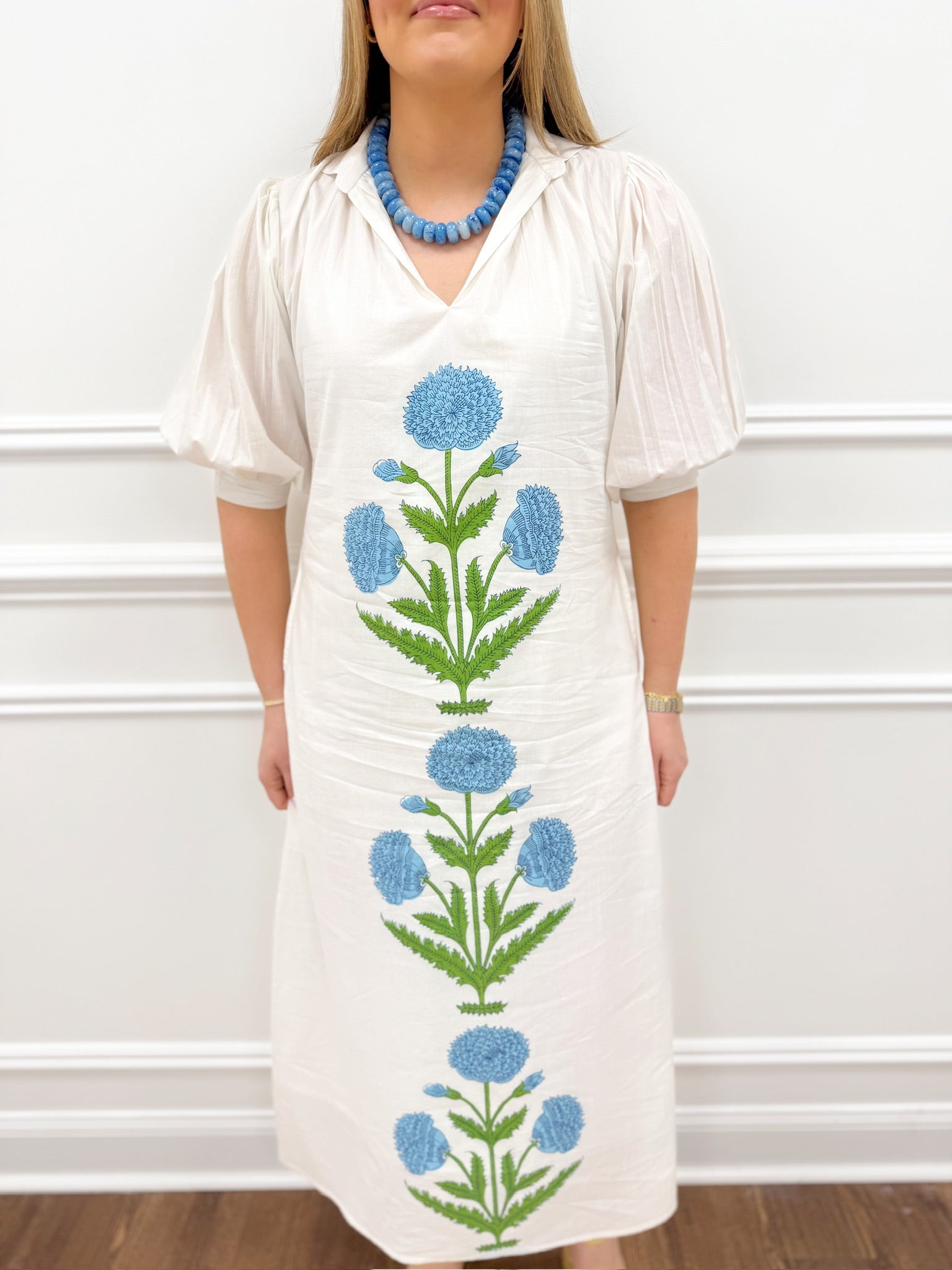Stunning elegant white dress featuring a slight puff sleeve design and captivating green and blue floral print. This timeless piece runs true to size and is available in XS through Large. Perfect for any occasion that calls for effortless sophistication.