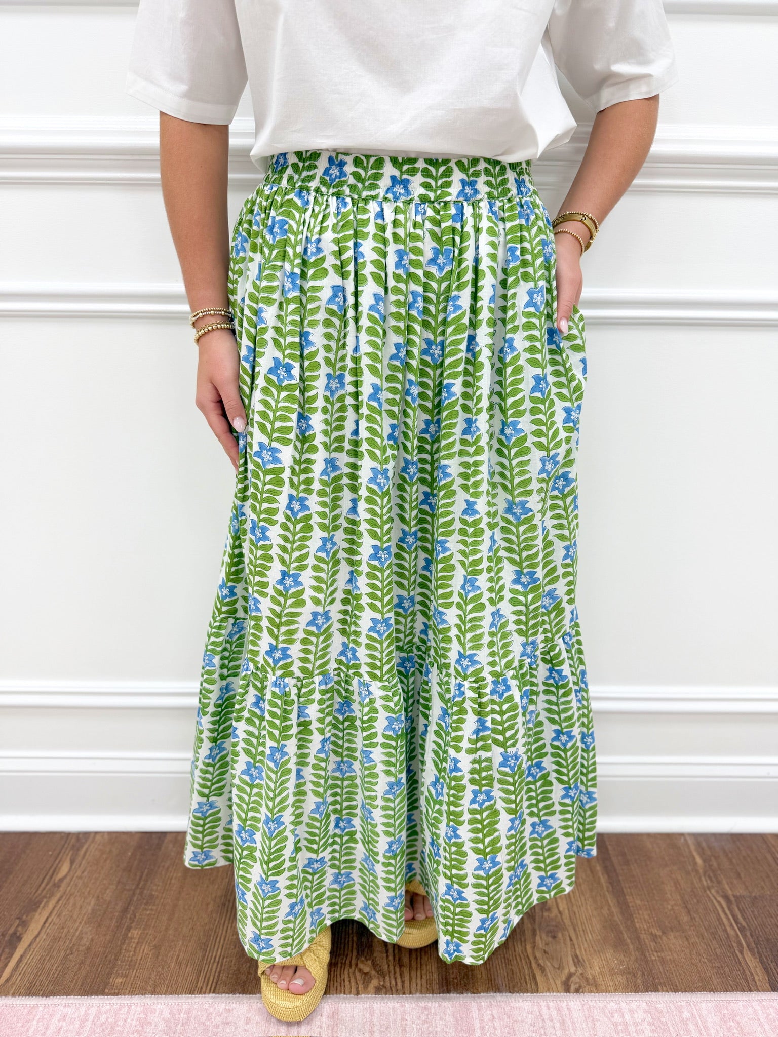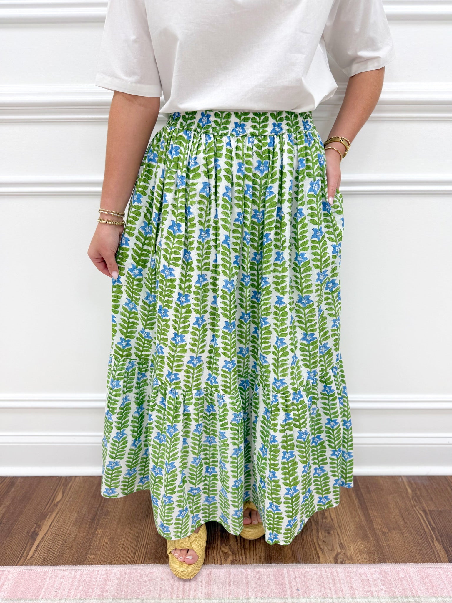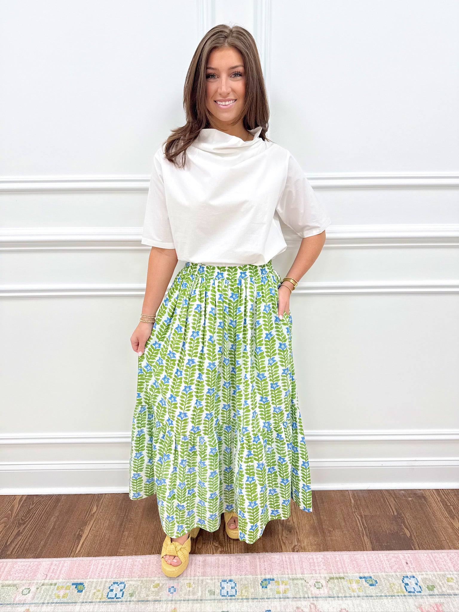 Stunning printed skirt featuring gorgeous green, blue, and white tones. Runs true to size with options from XS through Large. Model Alison is wearing the XS for reference on fit and length.