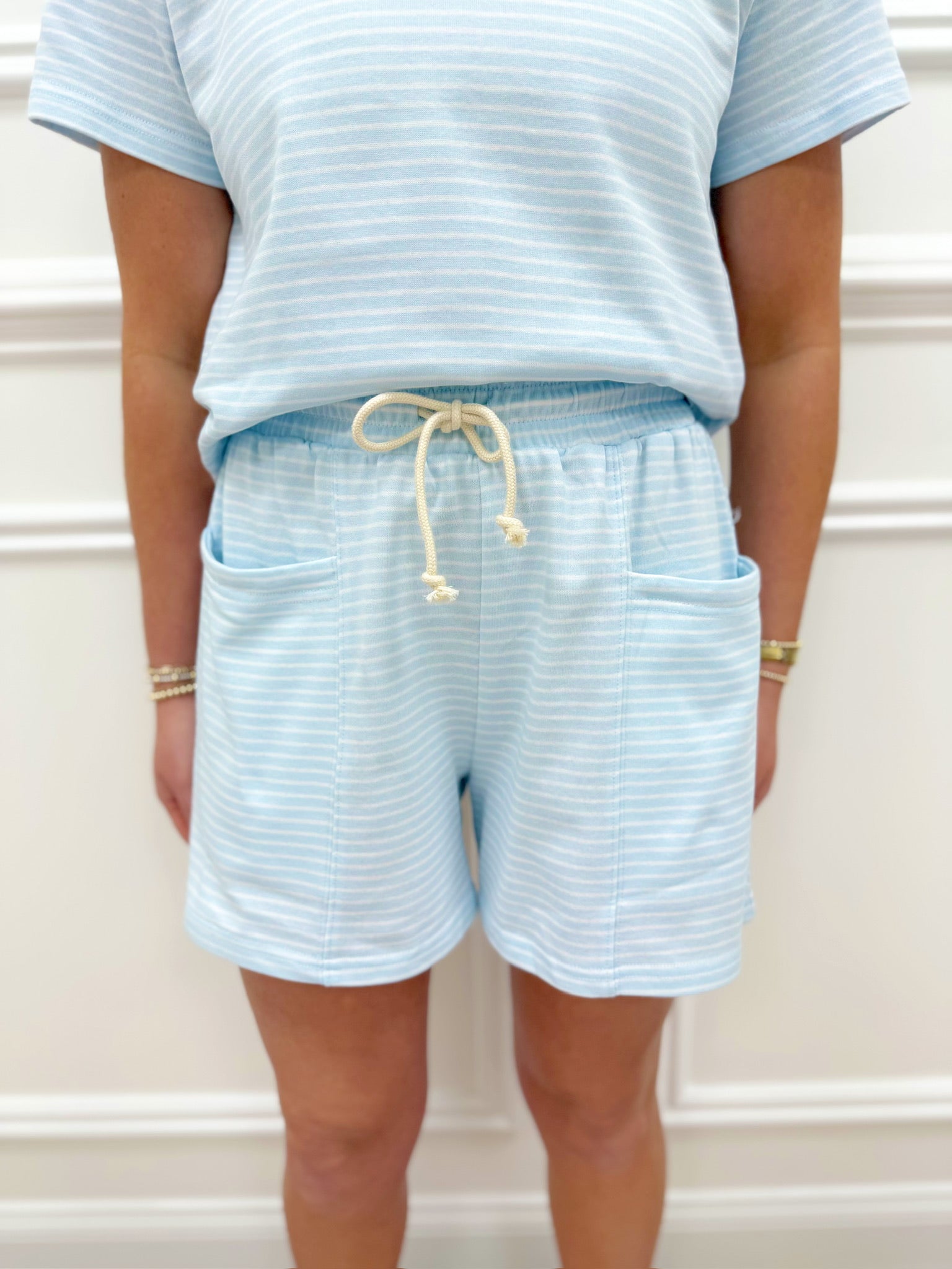 Brighten your warm-weather wardrobe with these Leslie Striped Shorts in cheerful blue. Featuring a comfortable drawstring waist for an adjustable fit and a true-to-size cut, these shorts are perfect for casual days, outdoor adventures, or relaxed weekends. The playful striped pattern adds a fun pop of color to any outfit. Lightweight and easy to wear, they're your go-to choice for effortless style.