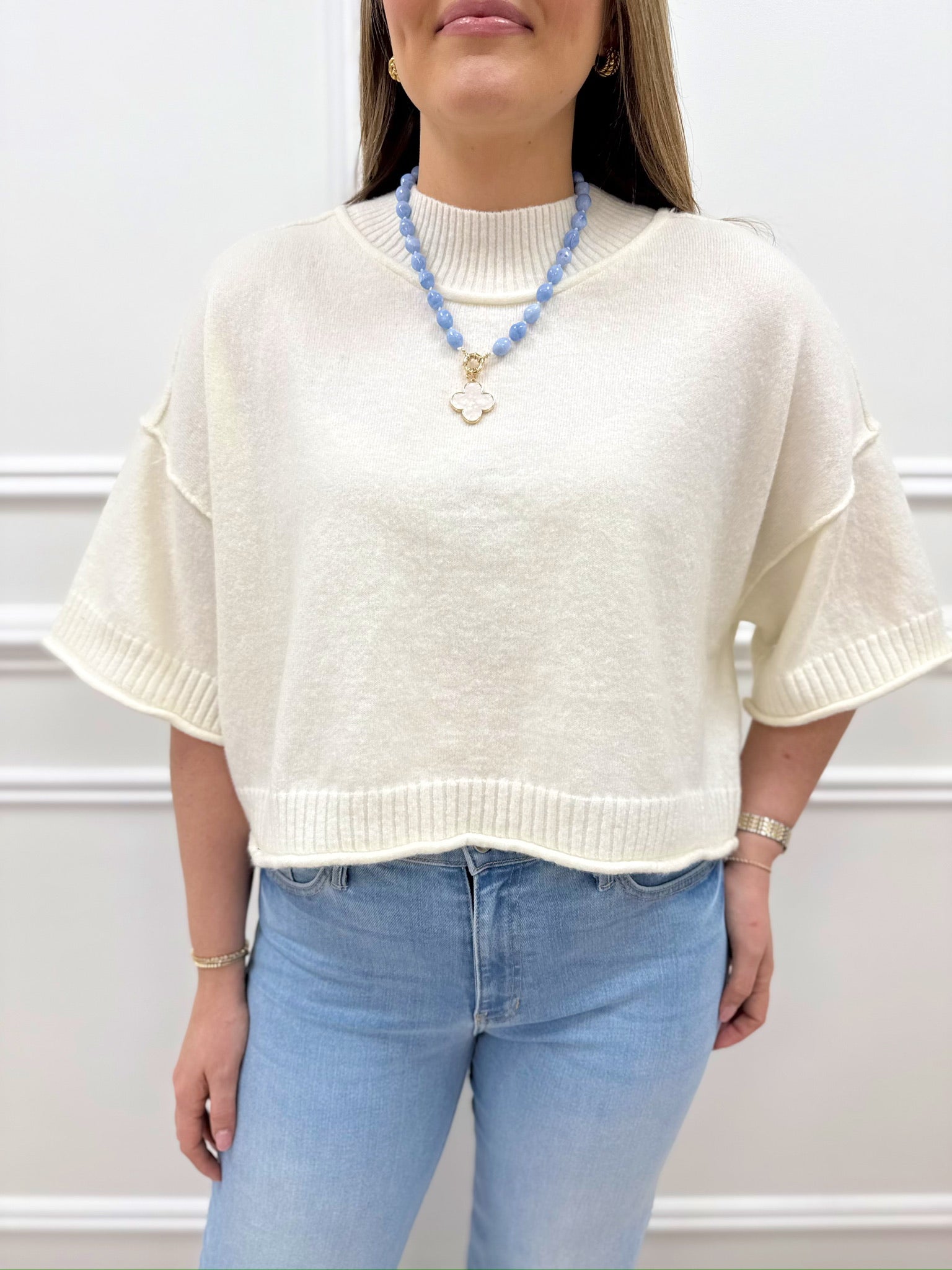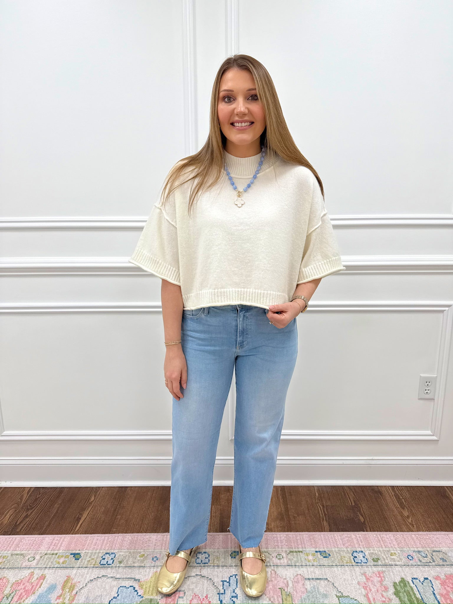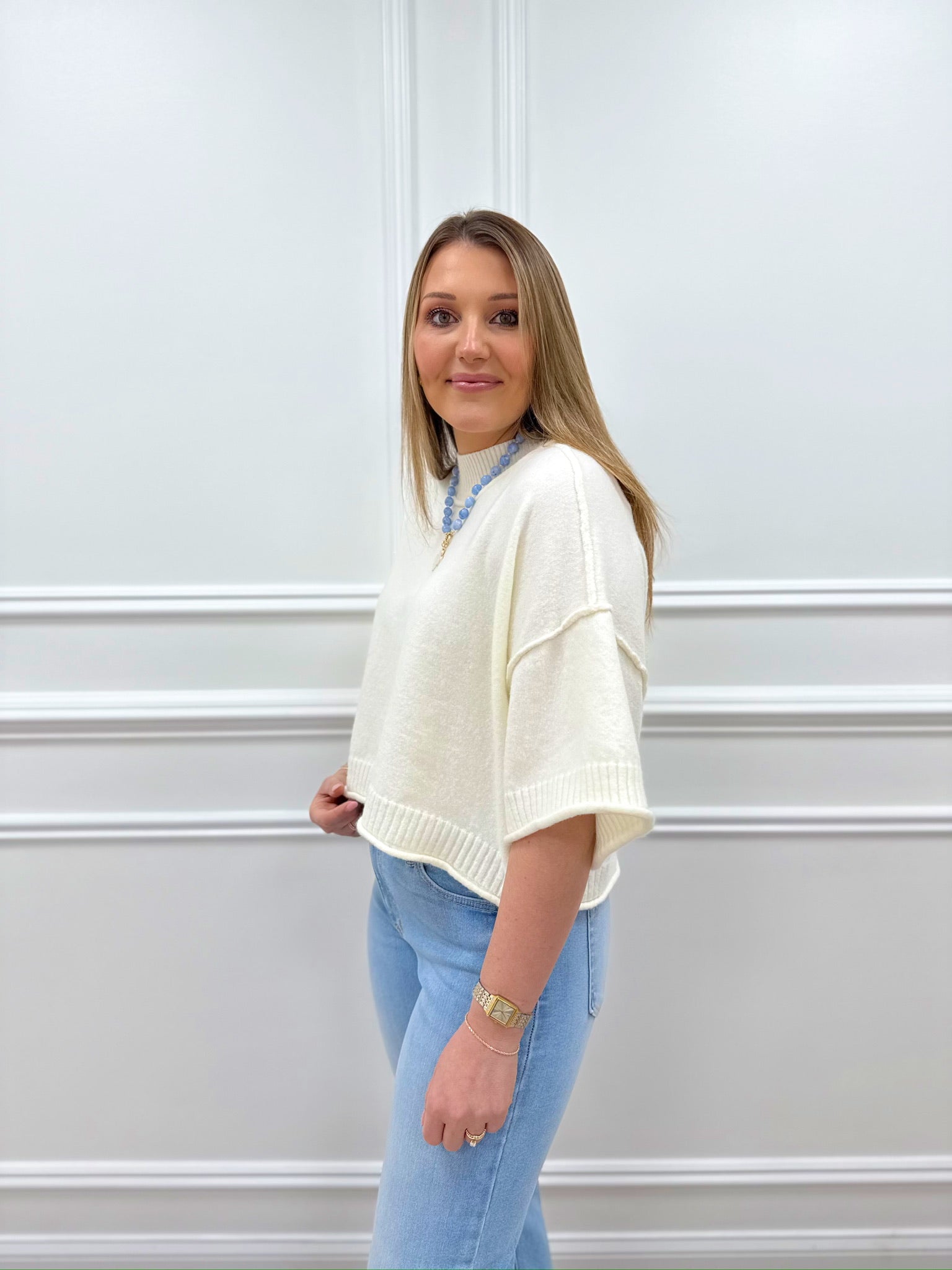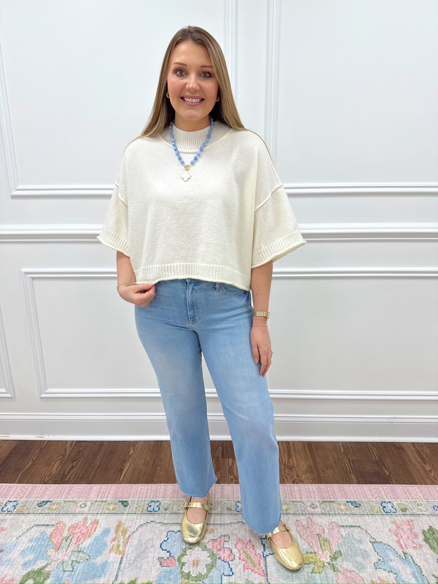 The Maggie Cream Top combines effortless style with thoughtful design details. This marled knit sweater features a flattering semi-cropped silhouette and mock neck that works beautifully layered or worn solo. Wide short sleeves with rubbed cuffs add contemporary flair, while ribbed accents at the neckline, cuffs, and hem provide structure and a polished finish. Raw edge seam detailing elevates the look with subtle texture. Perfect for transitional weather, this versatile cream piece pairs seamlessly with everything from high-waisted jeans to midi skirts.