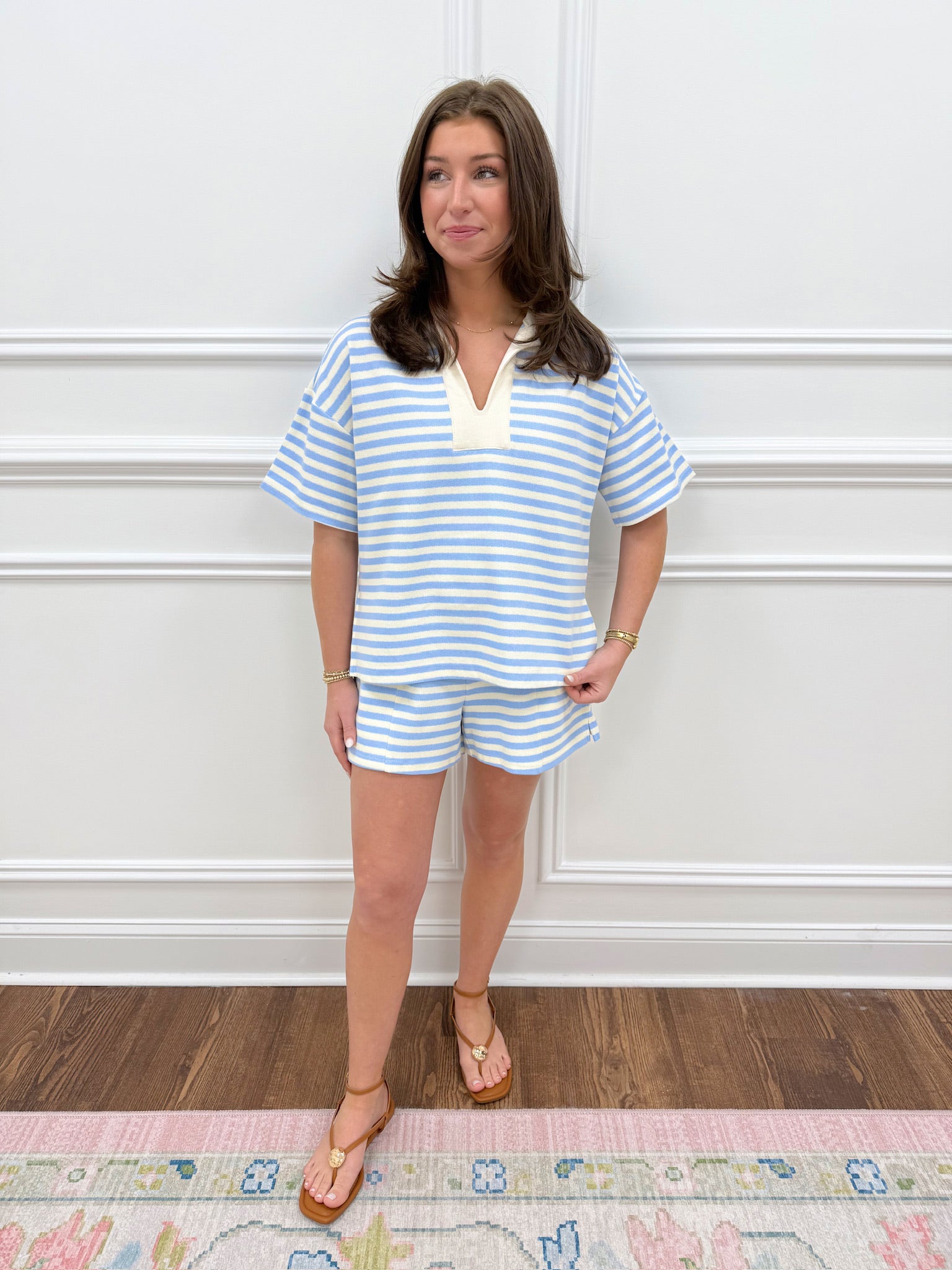 The Maya Striped Top features classic horizontal stripes that pair perfectly with our matching shorts for a coordinated, put-together look. Designed to run true to size, this versatile top works seamlessly with the matching set or styled separately for everyday wear. The striped pattern adds visual interest while remaining timeless and easy to mix and match with your existing wardrobe.