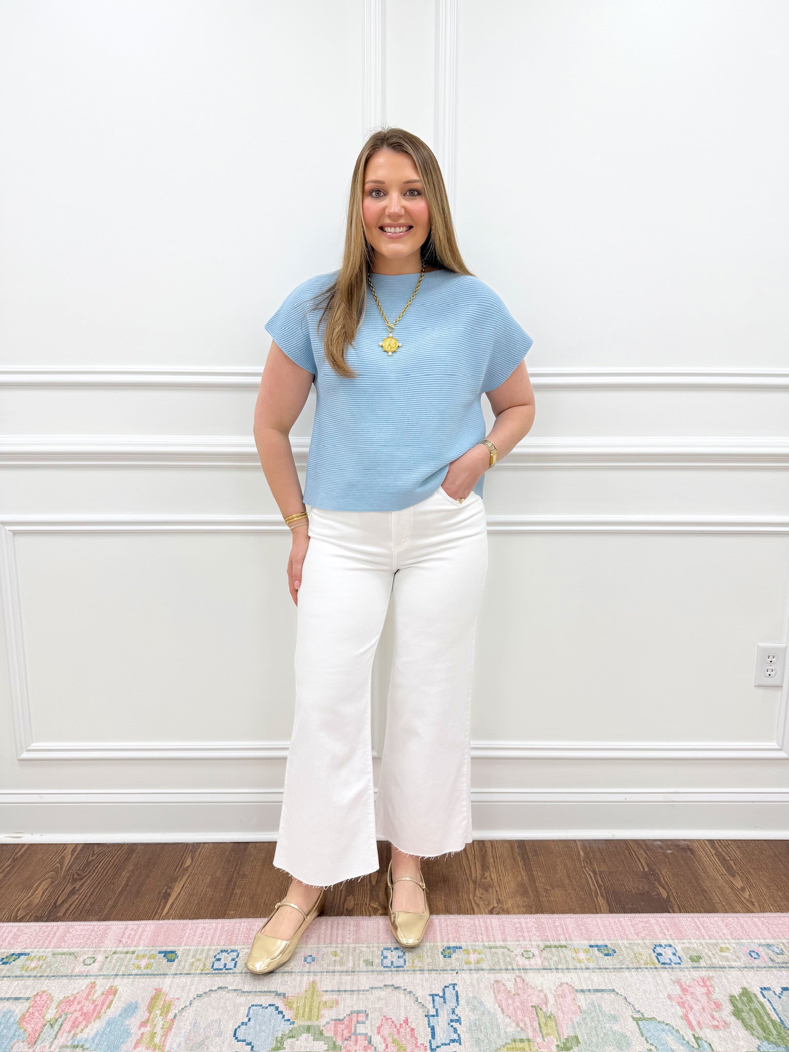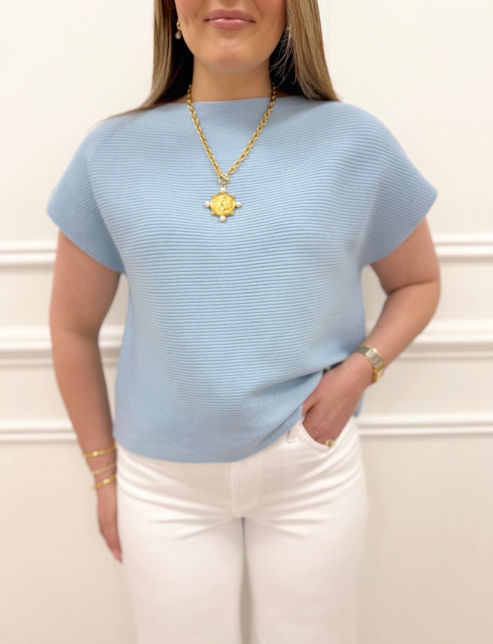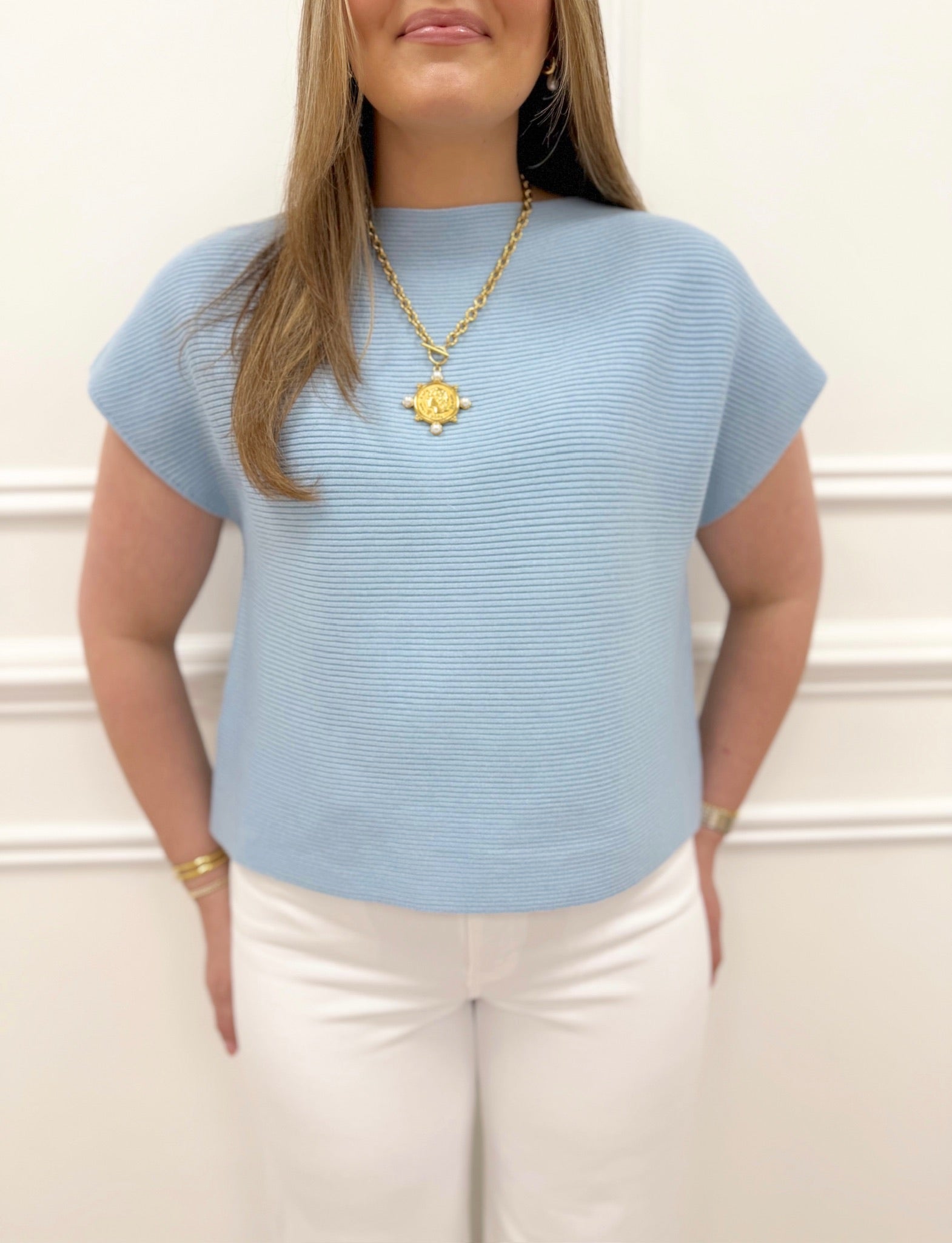 The Quinn Blue Top is a lightweight sweater material perfect for spring layering. Crafted from soft, breathable fabric, this short-sleeve top offers comfort without bulk. Runs true to size for an effortless fit. Ideal for mild weather and versatile enough to pair with your favorite bottoms.