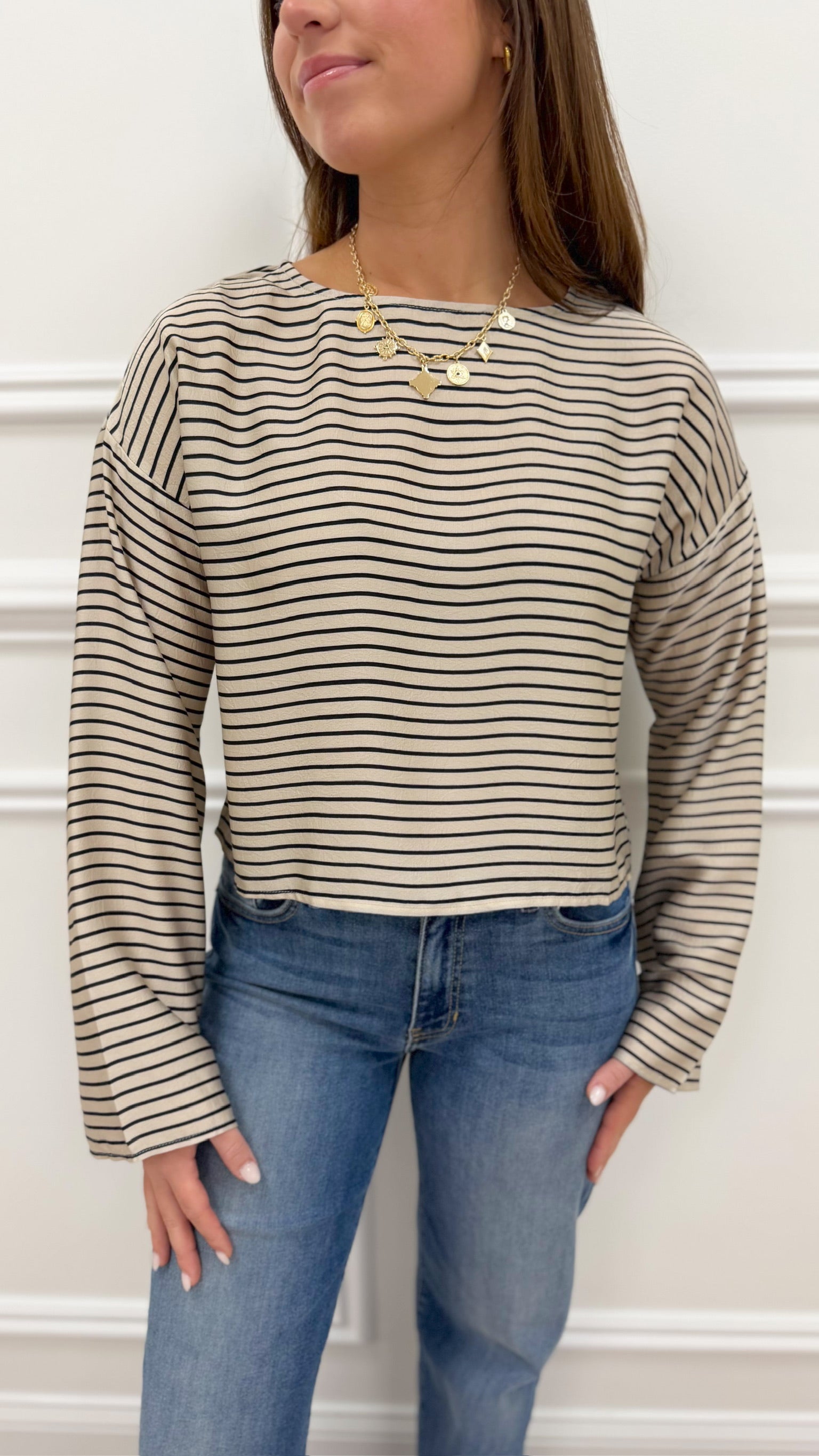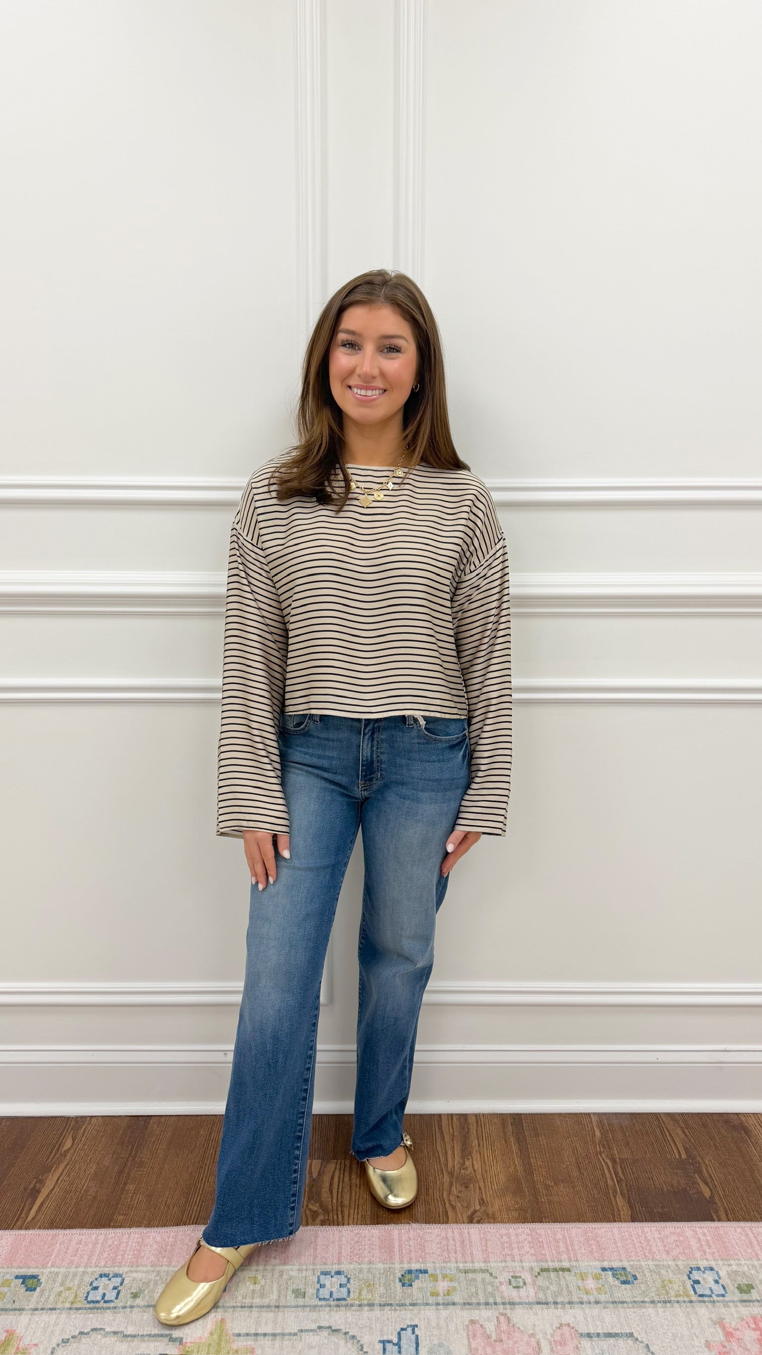 Elevate your wardrobe with the Grace Striped Top in classic black. This charming piece features eye-catching stripes and a gorgeous flare sleeve that adds movement and dimension to any outfit. Perfect for dressing up or down, it's a versatile staple that works beautifully with jeans, skirts, or trousers. Available in sizes small through large, and true to size for a perfect fit every time. A must-have addition to your closet.