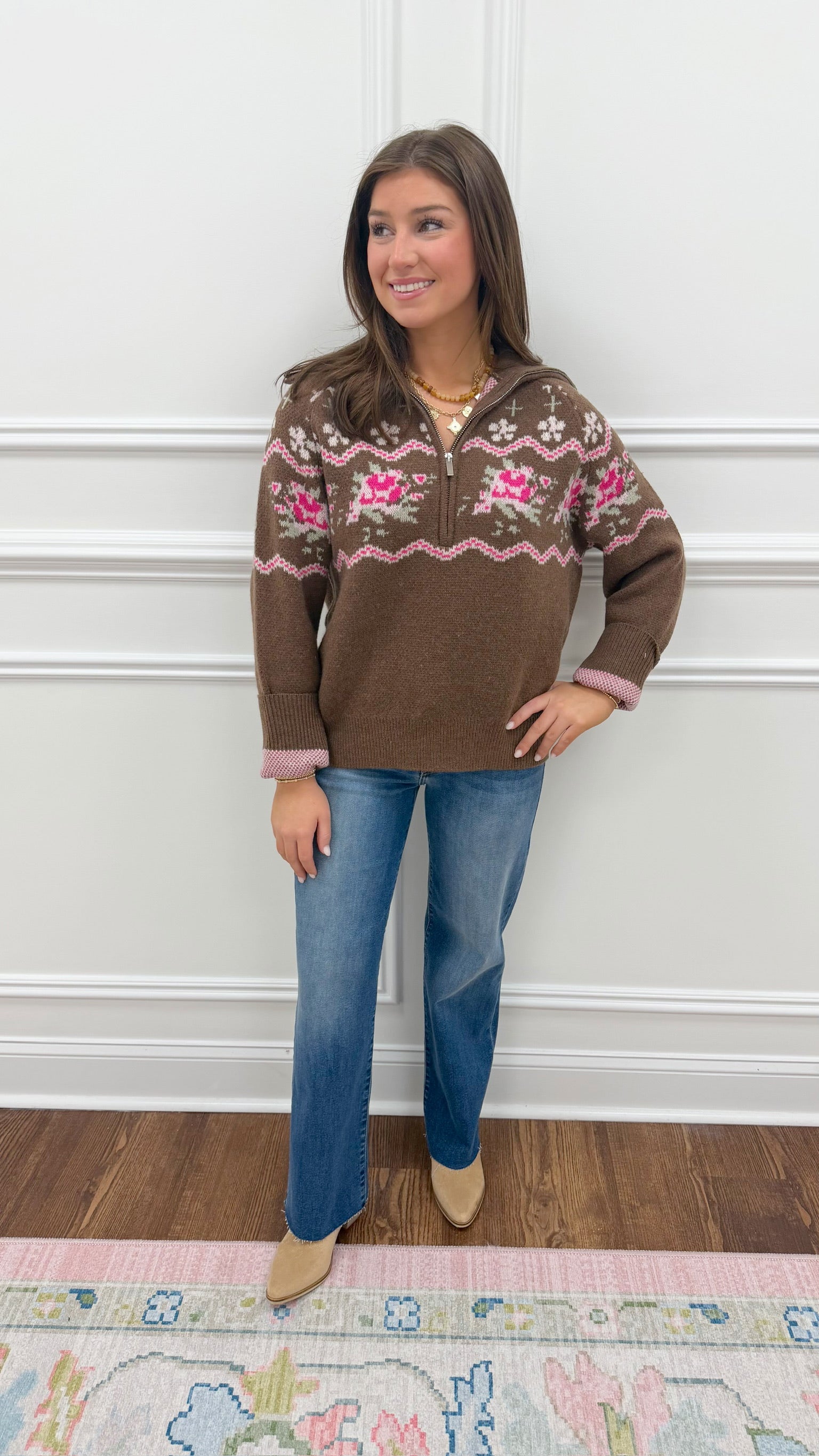 The Jada Printed Sweater is the cozy layer you'll reach for again and again. With its charming printed design and convenient half-zip closure, this sweater strikes the perfect balance between cute and practical. Layer it over your favorite tee or wear it solo for an instantly polished look that works for casual hangouts or relaxed workdays. The soft, comfortable fabric keeps you warm without the bulk, while the playful print adds personality to any outfit. Available in sizes Small through Large, the Jada Printed Sweater is your new wardrobe essential for effortless style.
