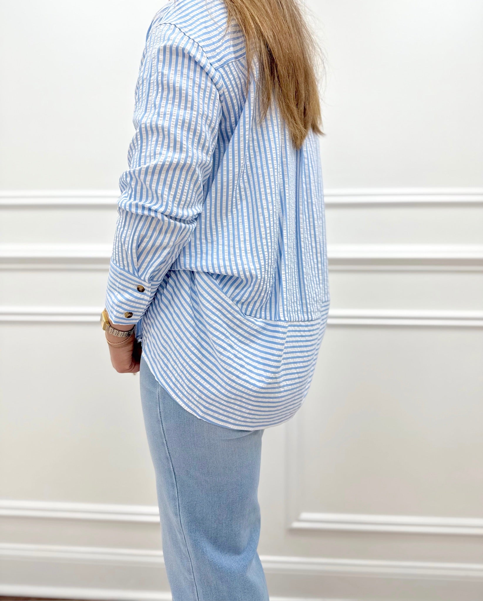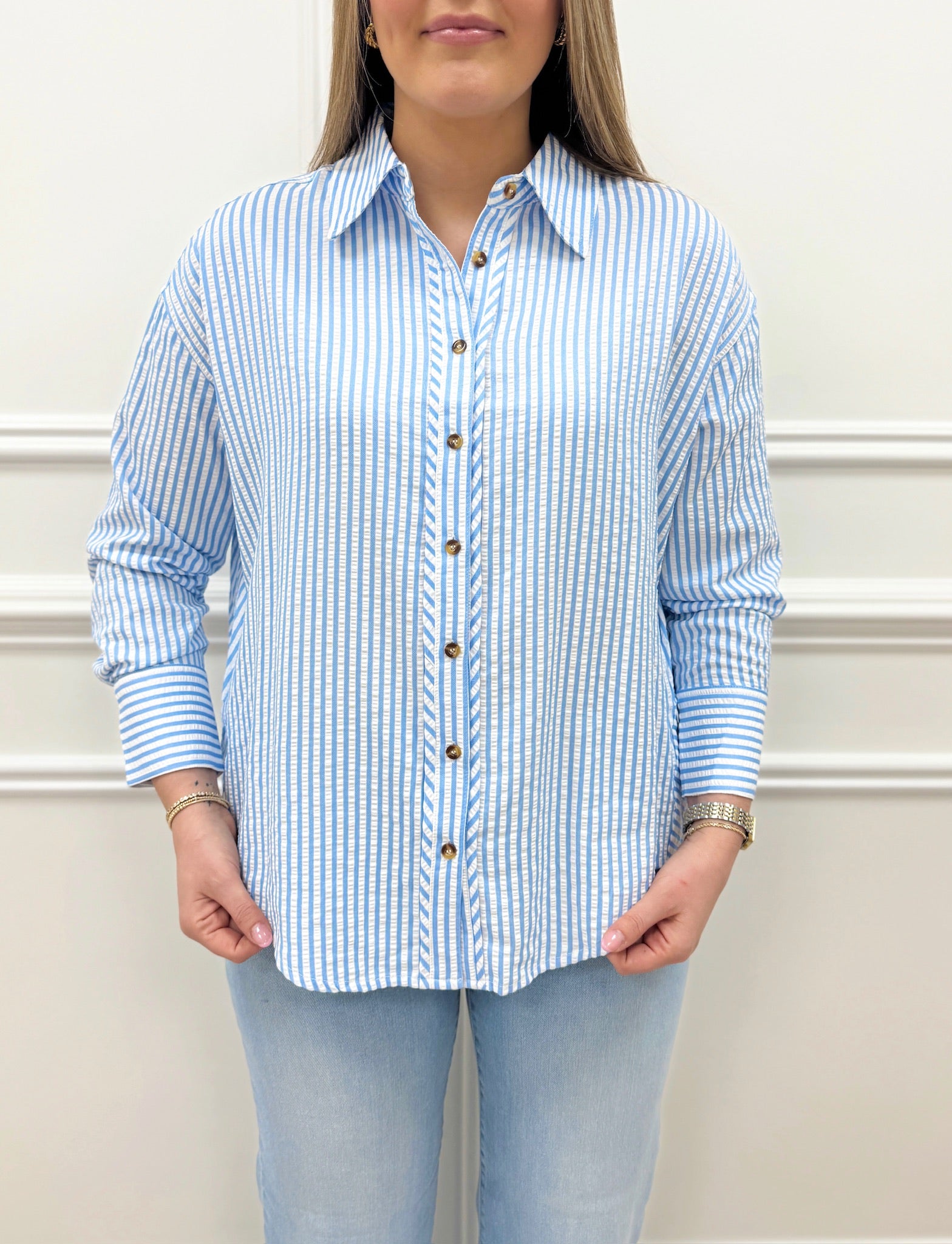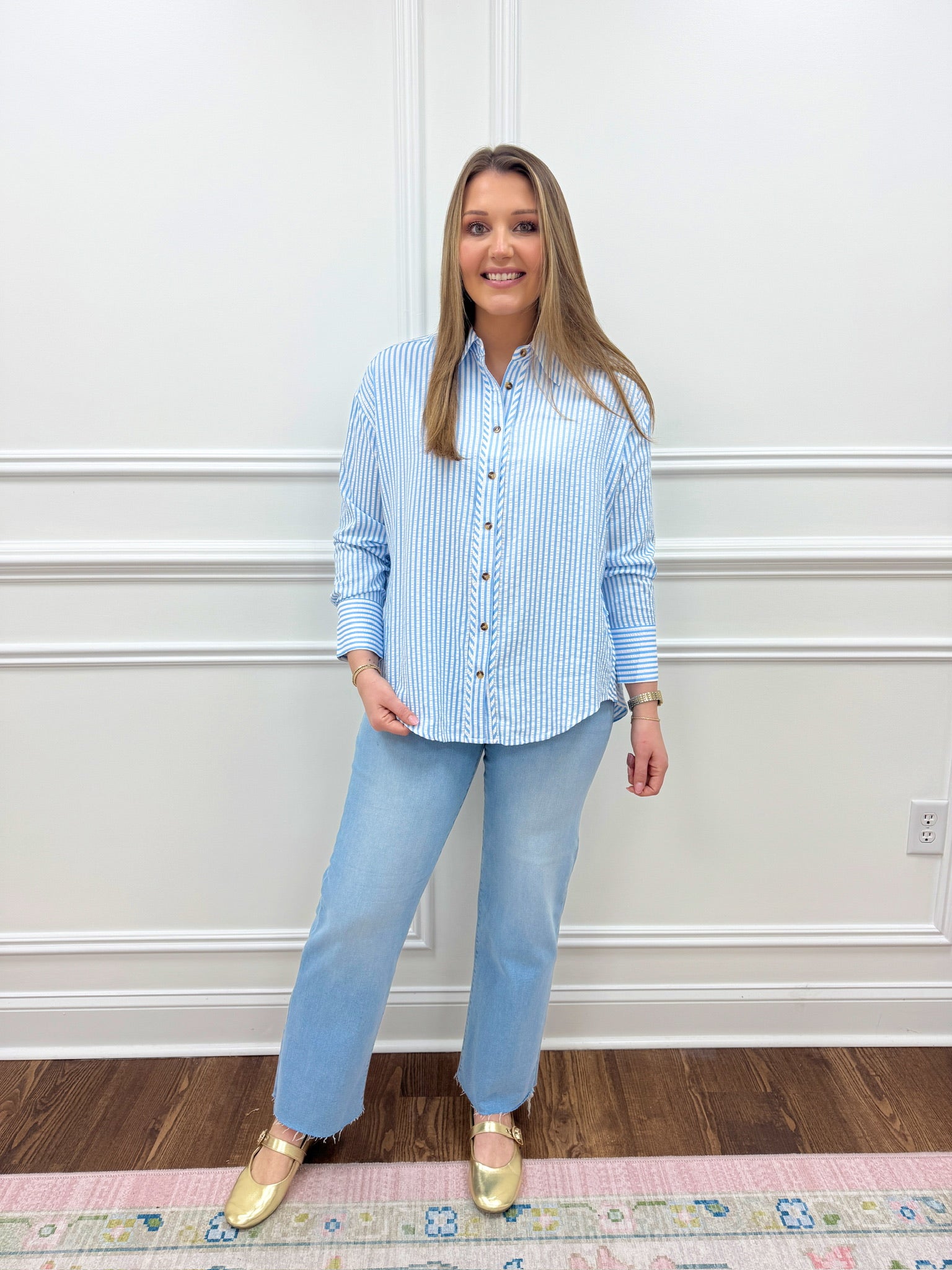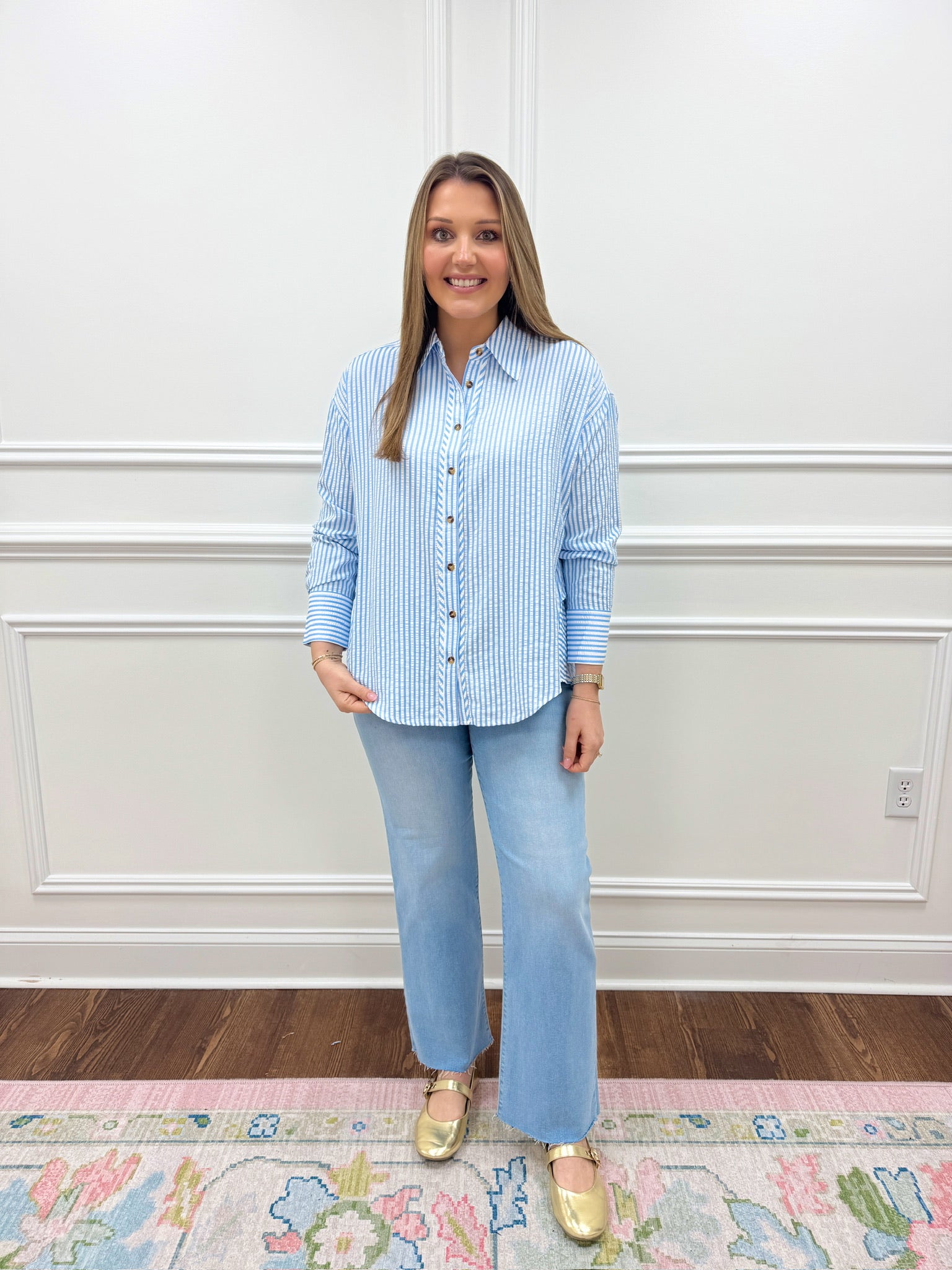 The Bailey Striped Top in Blue is a fun, versatile essential for your wardrobe. This playful striped button-up offers effortless style with a relaxed, slightly oversized fit that's perfect for layering or wearing loose. As modeled by Macie in a small, you can size down for a more fitted silhouette or embrace the generous cut for comfortable ease. The classic button-up design makes it incredibly versatile—wear it solo, tie it at the waist, or layer it over your favorite basics. With its charming stripes and easygoing vibe, this top is ready for everything from casual days to weekend adventures.