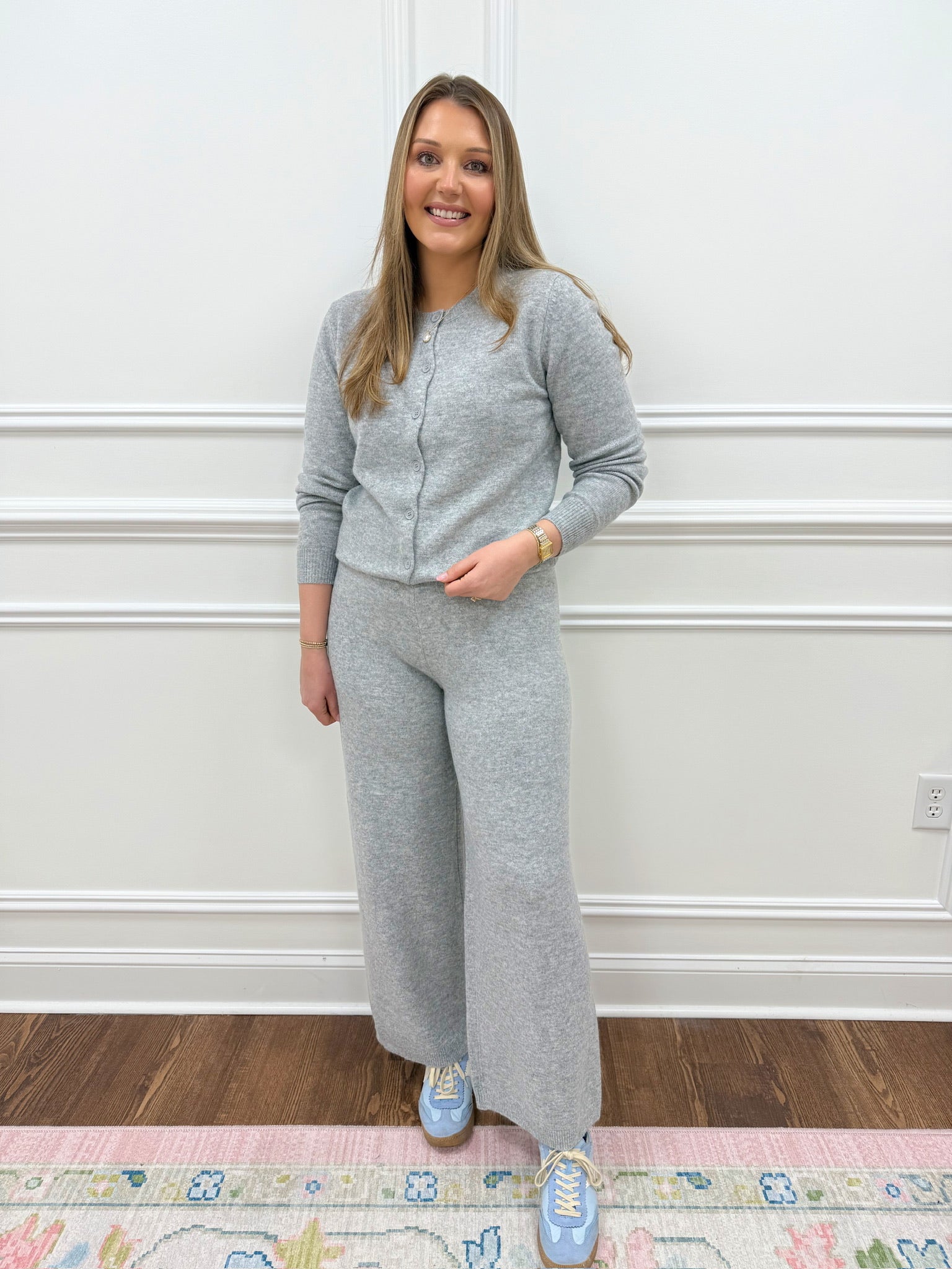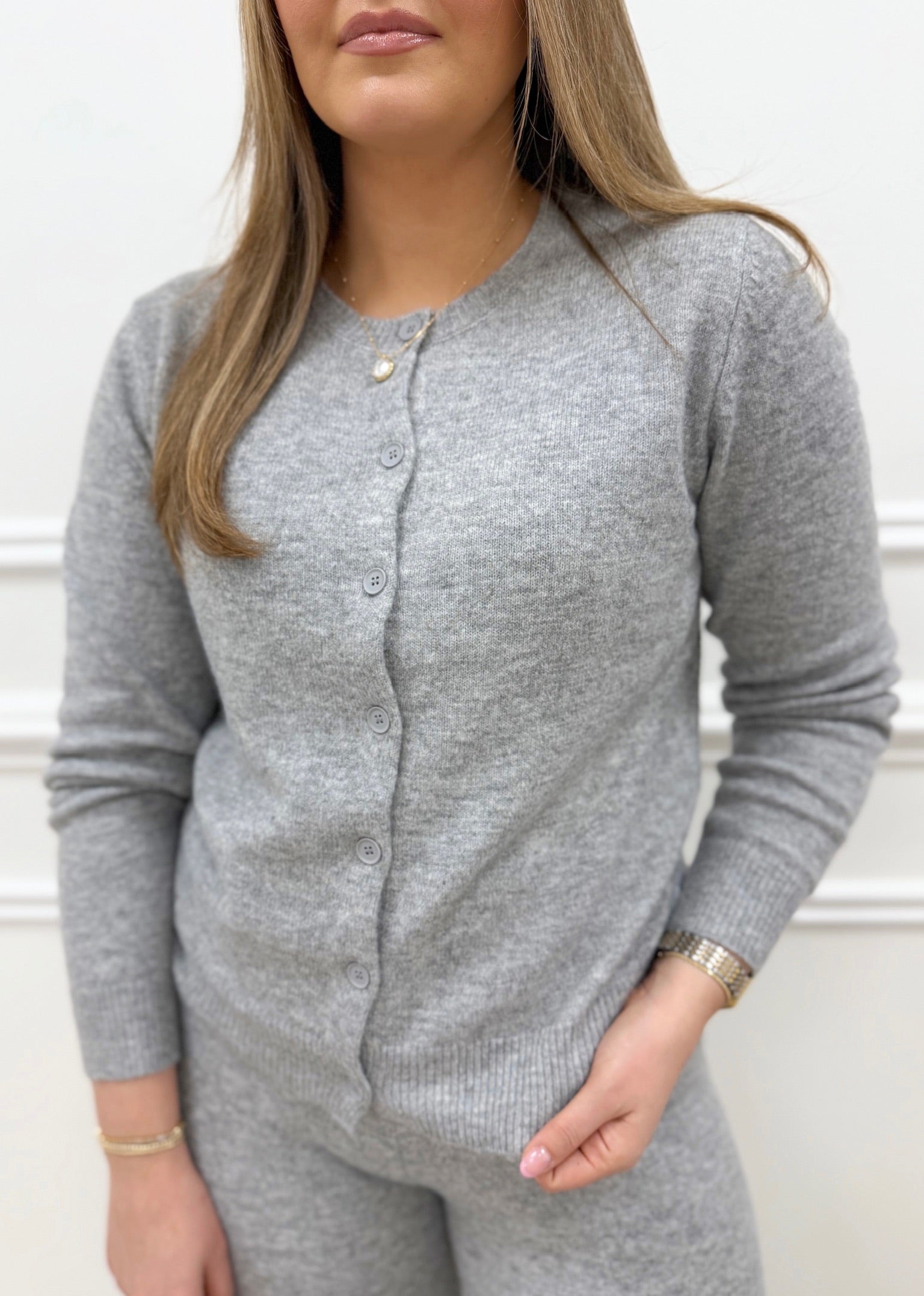 The Camie Grey Cardigan is your go-to layering essential that effortlessly elevates any wardrobe. This versatile piece pairs beautifully with our matching grey pants for a polished, coordinated look. Crafted to fit true to size, it's available in sizes small through XL, ensuring the perfect fit for everyone. Whether you're dressing up for the office or keeping it casual, this timeless grey cardigan delivers both comfort and style. See it styled on our model wearing the XL for inspiration on how to make it work for you.