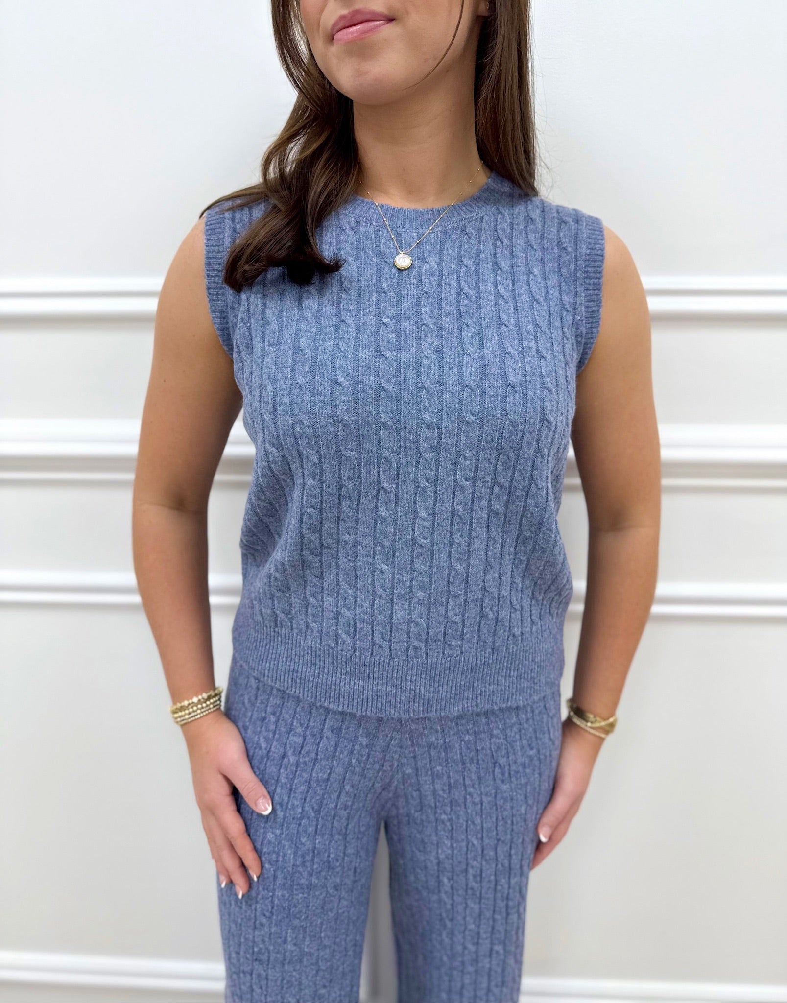The Julie Blue Tank brings timeless elegance with its charming cable knit texture. This cute essential pairs beautifully with our matching pants for a coordinated, put-together look. Crafted from quality knit material that feels as good as it looks, it's perfect for layering or wearing solo. Running true to size and available in small through XL, you'll find your ideal fit. Check out how our model Alison styles it in a medium for inspiration on making this versatile tank your new favorite piece.
