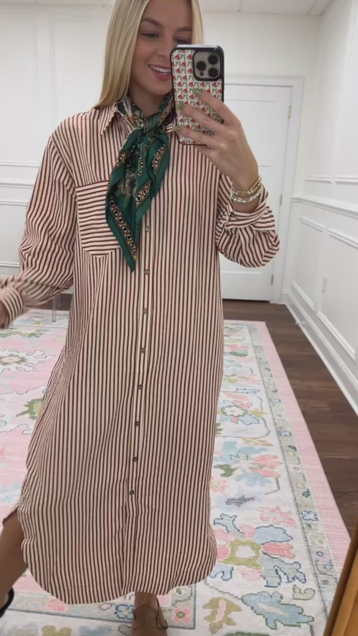 The Erica Striped Dress is a must-have this season, featuring a lightweight cream and burnt red striped fabric that drapes... Details