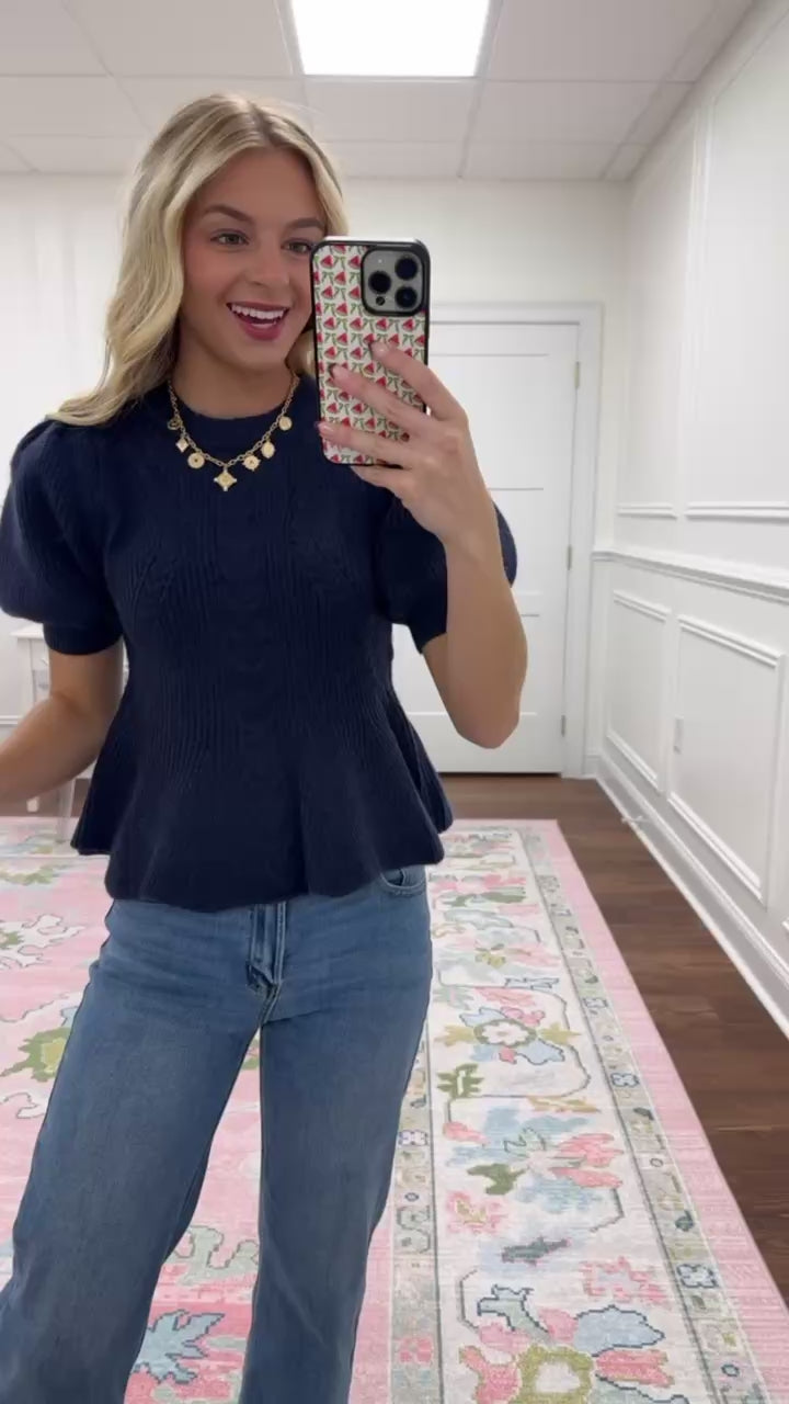 Elevate your wardrobe with the Parker Navy Top, a fun knit piece featuring flattering puff sleeves that enhance your silhouette.... Details